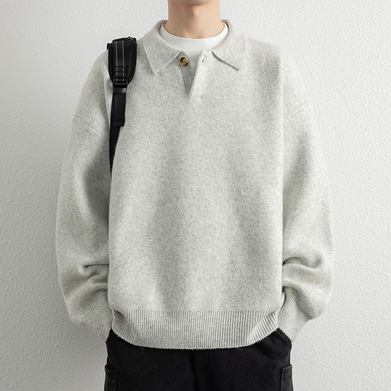 高质量简约翻领男士针织衫秋季新款复古polo领宽松慵懒风单扣毛衣