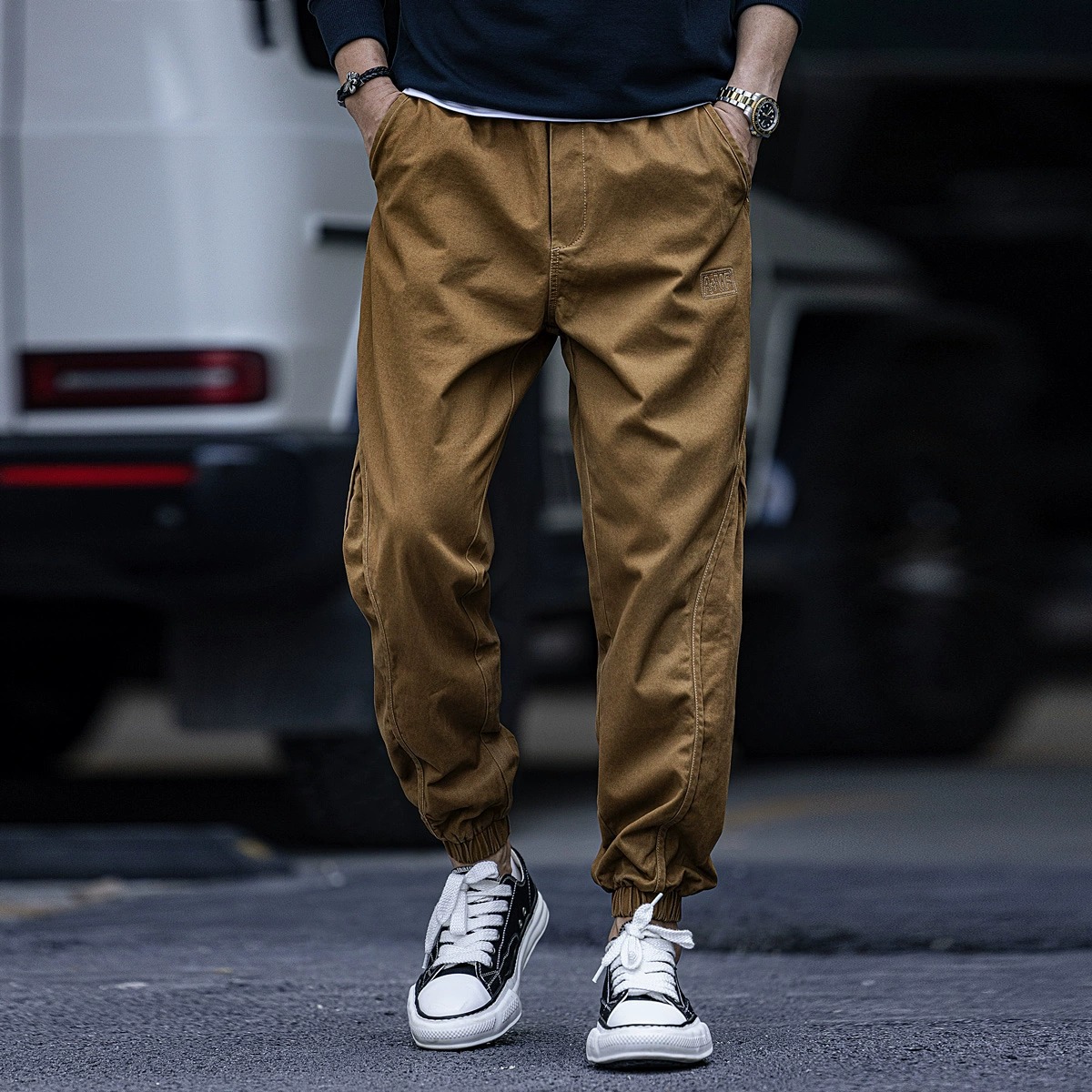 杏のベージュの多ポケットの工装のズボンの男性の秋冬のアメリカのファッションの札のゆったりしているしわの傘の兵の小さい大衆の屋外の突撃ズボン