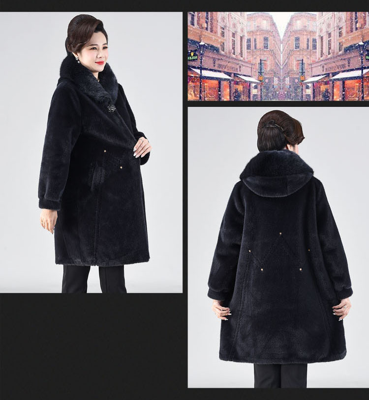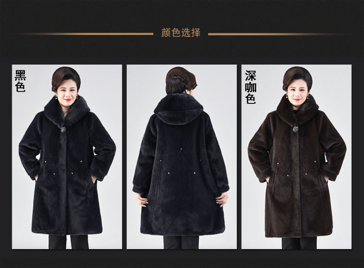 230斤の太ったお母さんの秋冬のコートの毛皮の一体の中高年のファッションの洋風の大きいサイズの帽子のゆったりしているコート