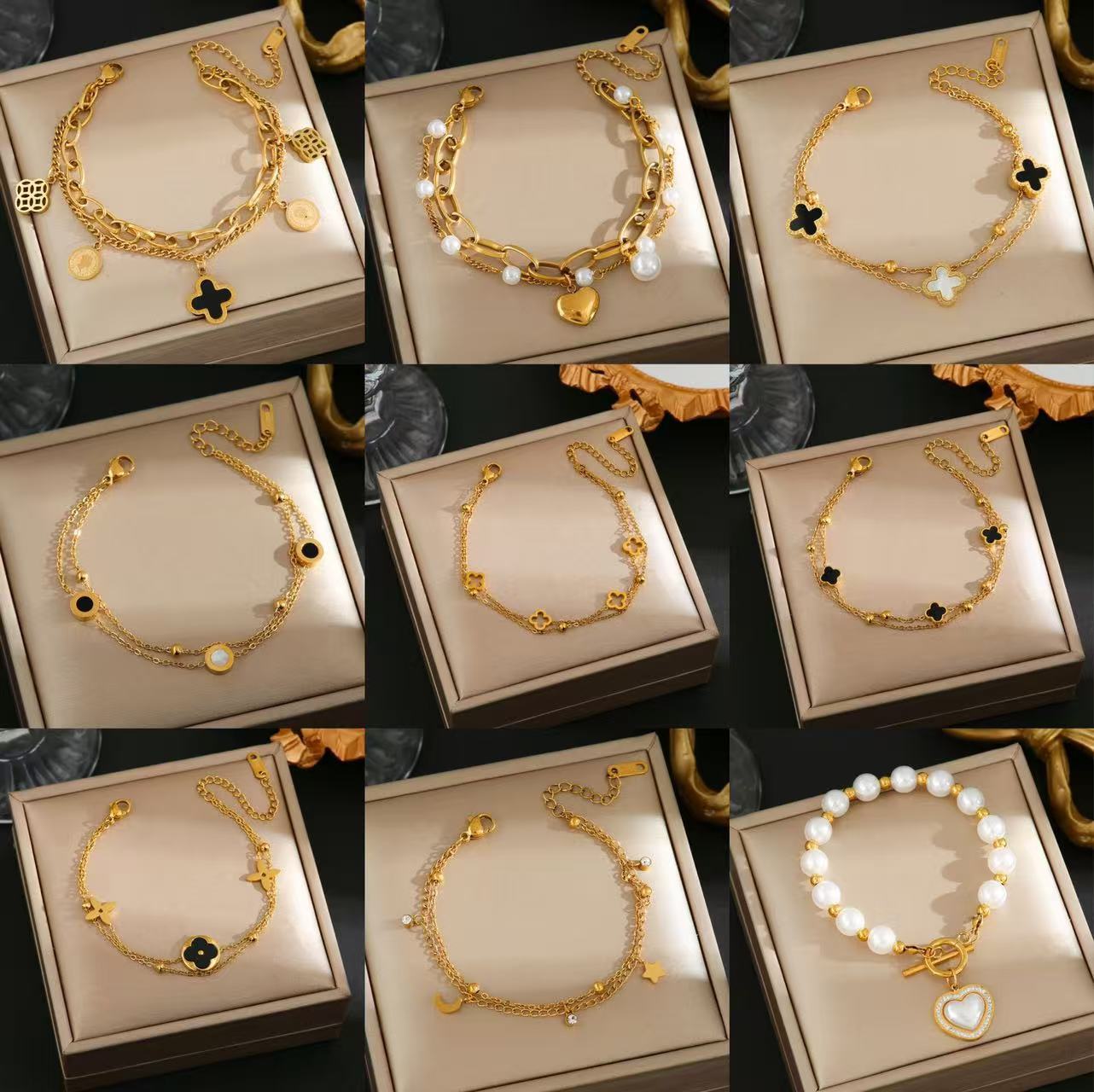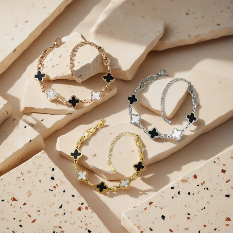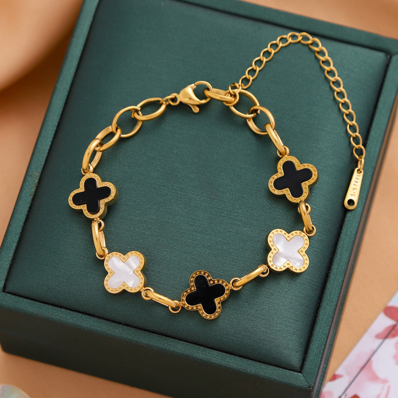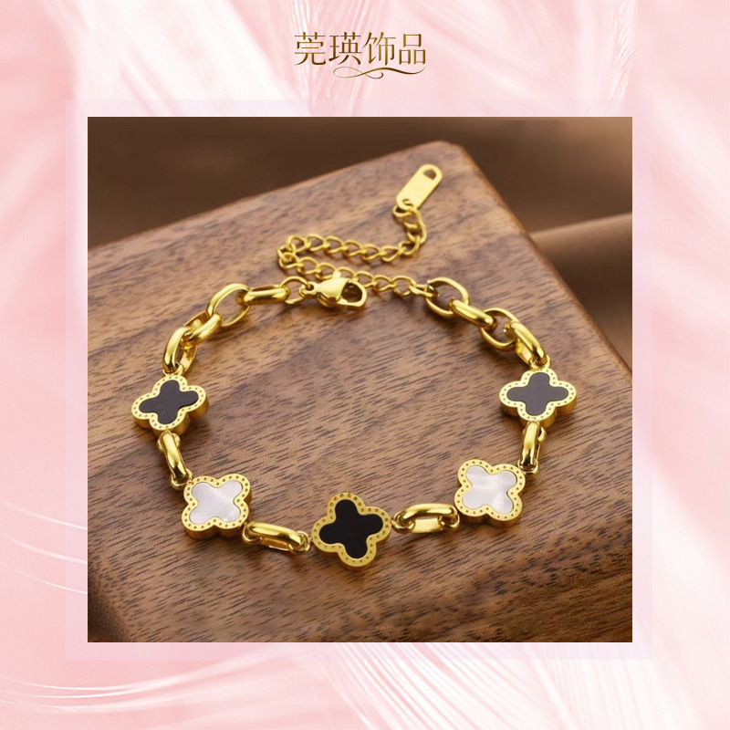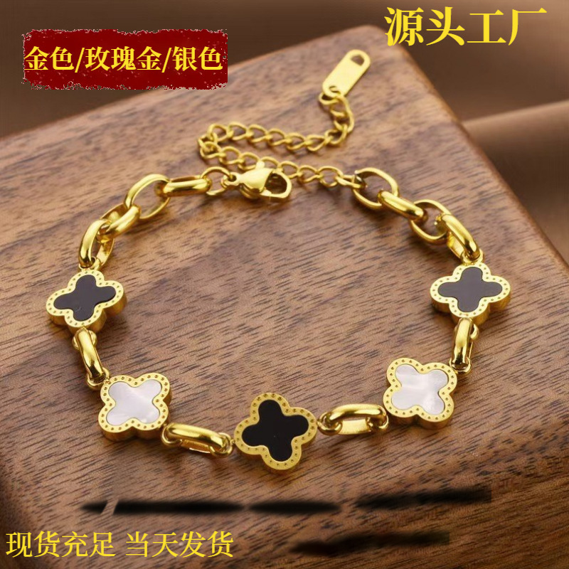 欧美跨境钛钢黑白贝四叶草五花手链女轻奢高级感气质不掉色手饰