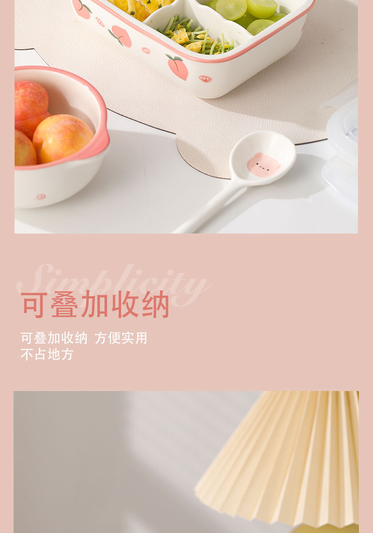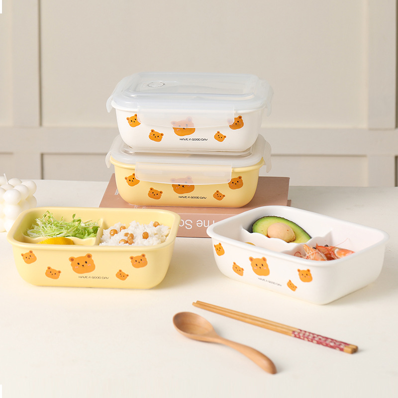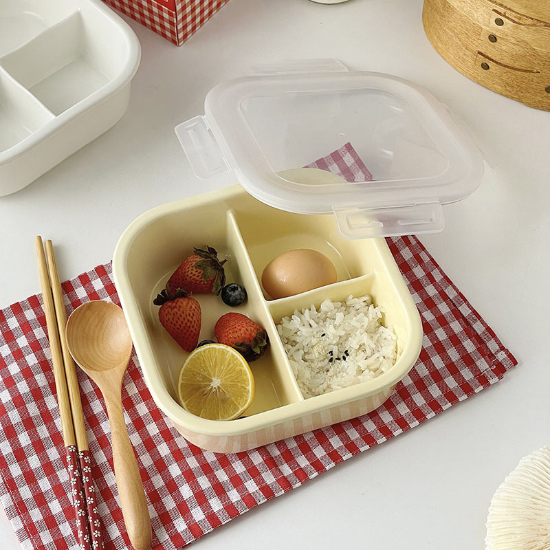 奶黄正方形保鲜盒分格收纳盒饭盒冰箱微波炉加热便当带饭陶瓷餐具