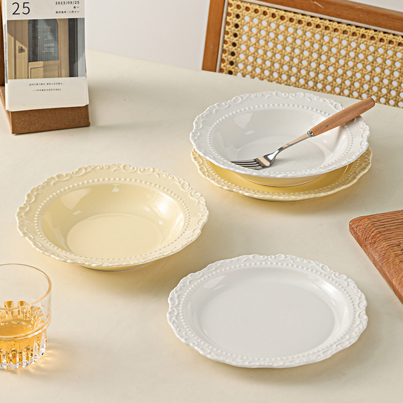 高級感のある食事皿レトロなレリーフ皿麦わら帽子皿家庭用陶磁器皿料理皿クリーム風皿パスタ皿