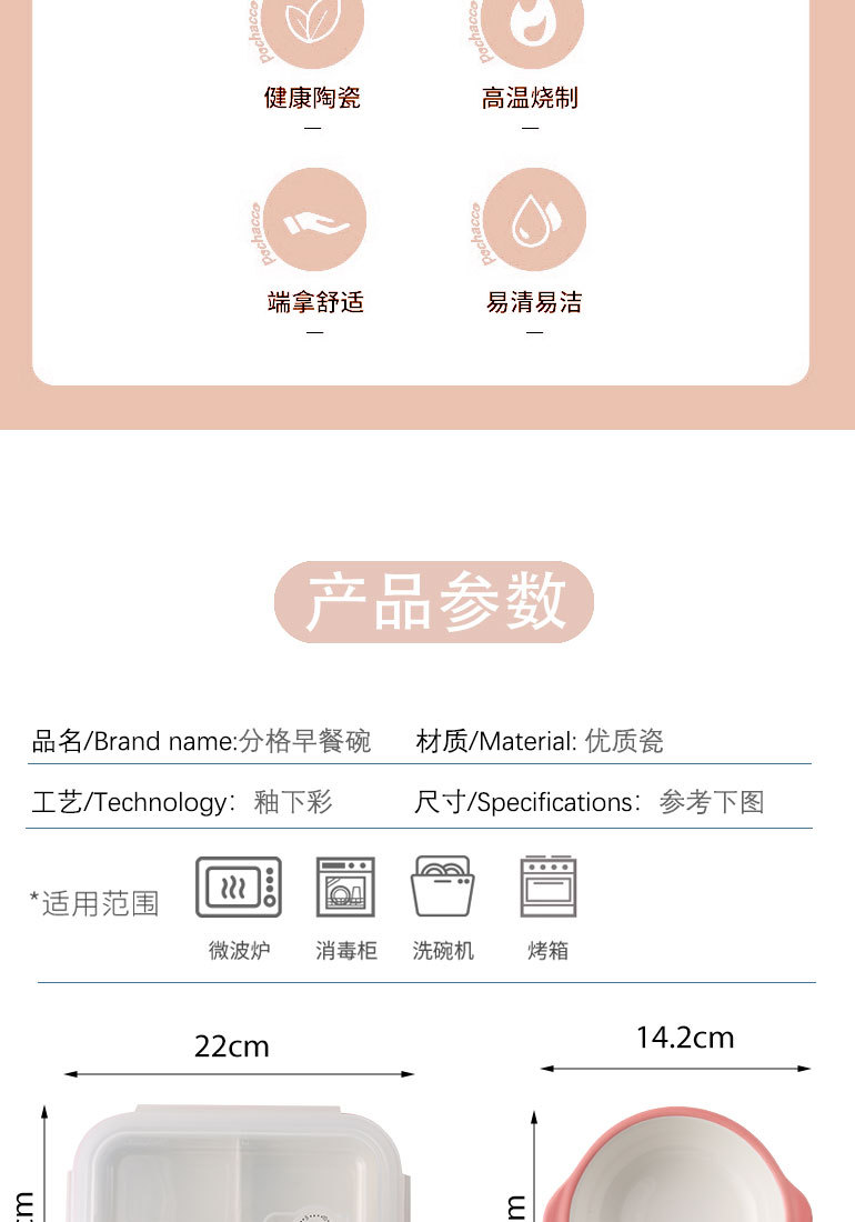 陶瓷分格饭盒微波炉加热上班族带盖可爱卡通学生保鲜碗圆形便当盒