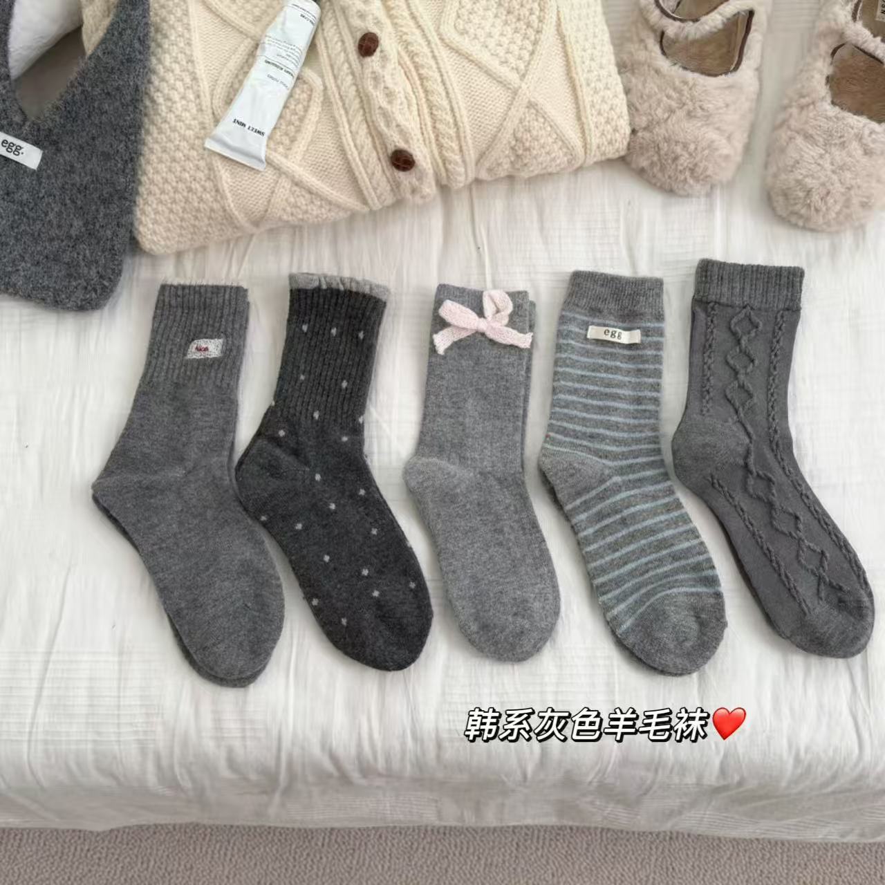 韩系灰色羊毛袜组合浣熊毛袜子兔毛蝴蝶结保暖加厚秋冬袜子女堆堆