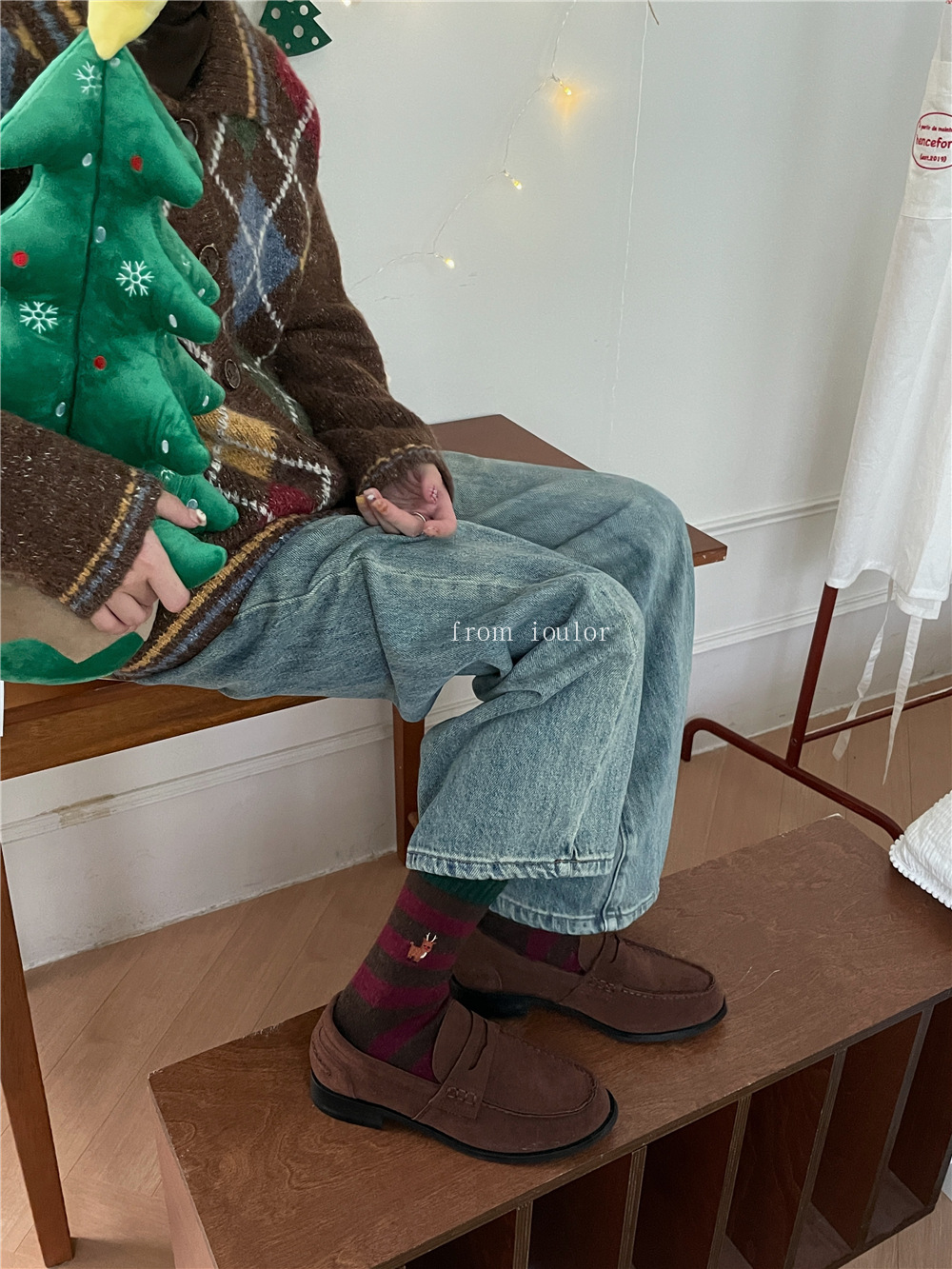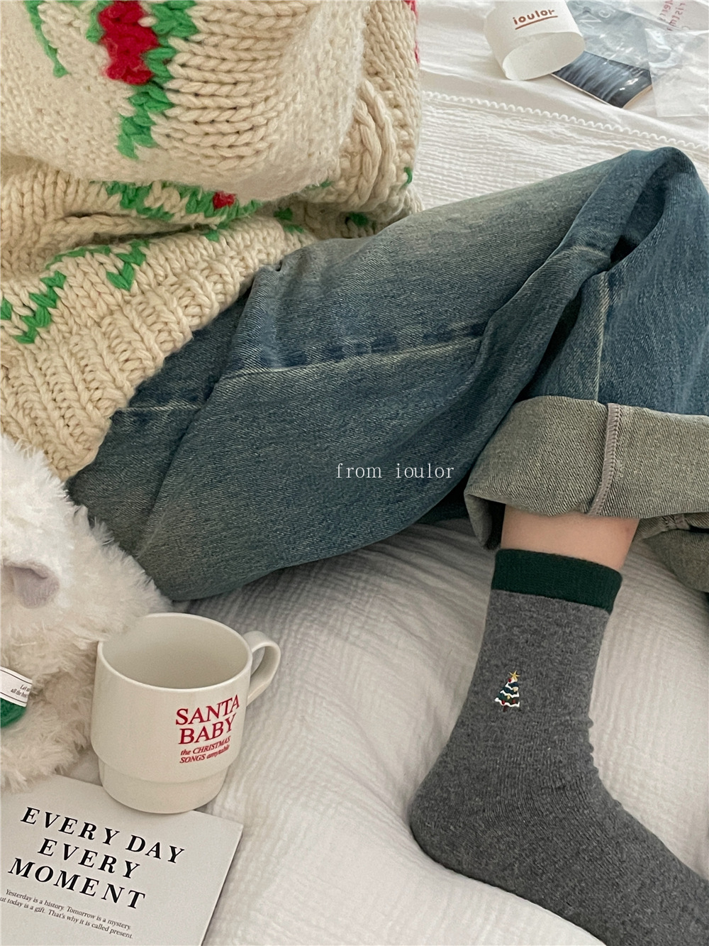 IOULOR圣诞节麋鹿撞色中筒袜秋冬季软糯保暖羊毛袜女士袜子无骨袜