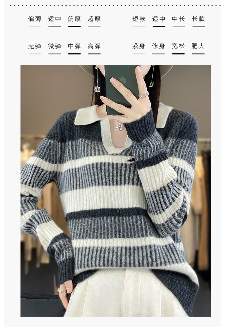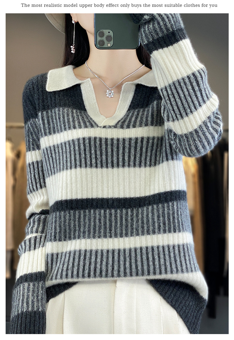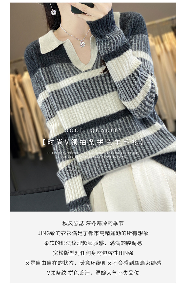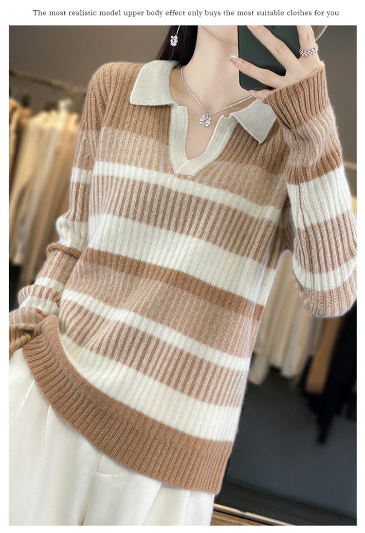 色合わせpolo襟のセーターの女性vネックの色合わせのニットの長袖のセーターはゆったりとしています。