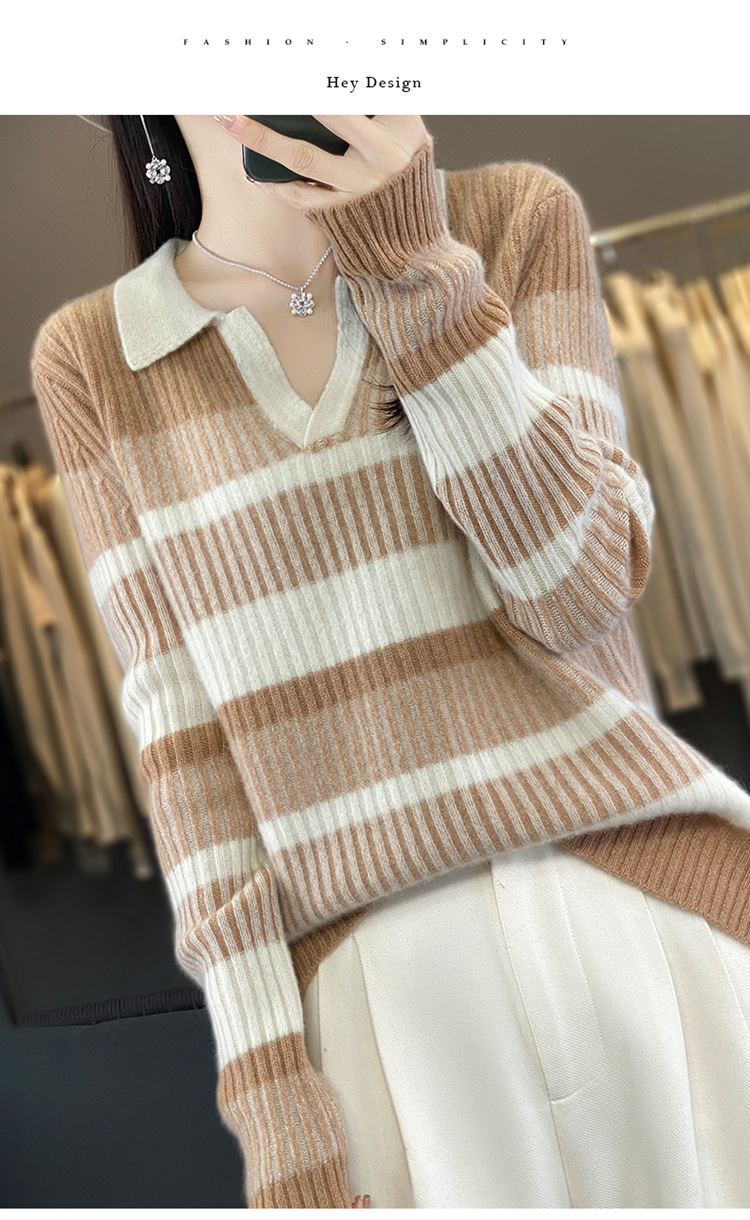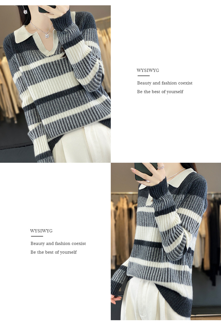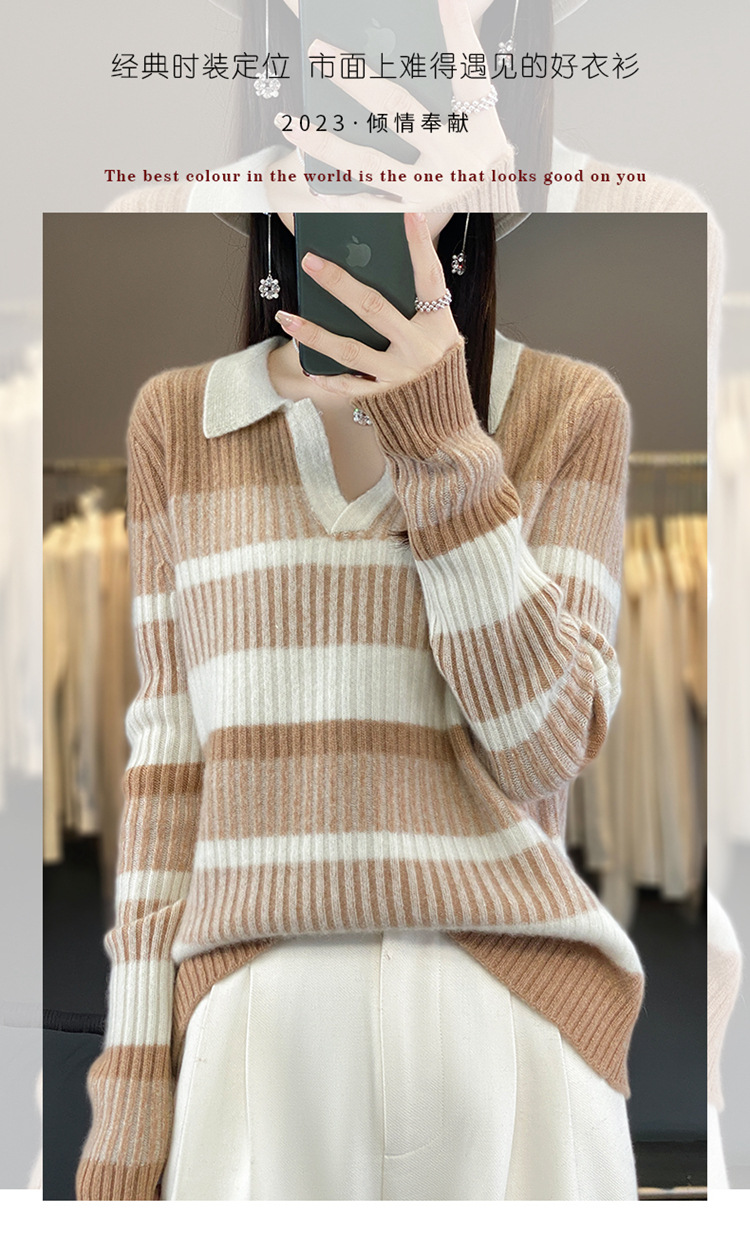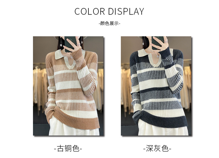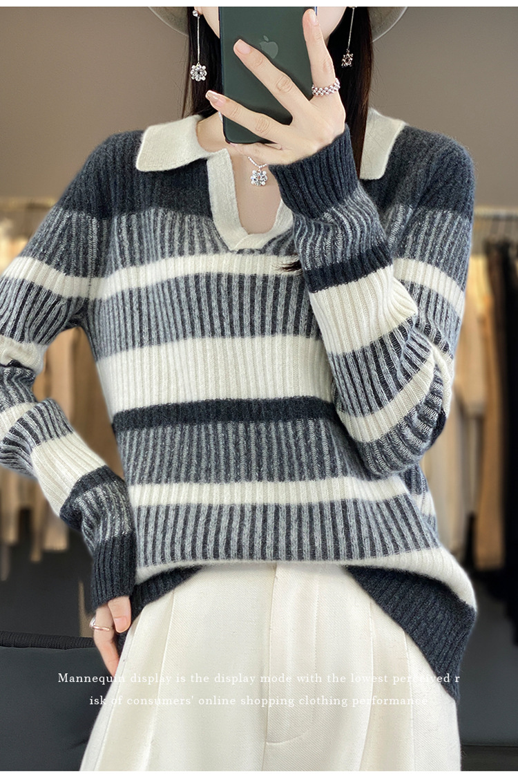 色合わせpolo襟のセーターの女性vネックの色合わせのニットの長袖のセーターはゆったりとしています。