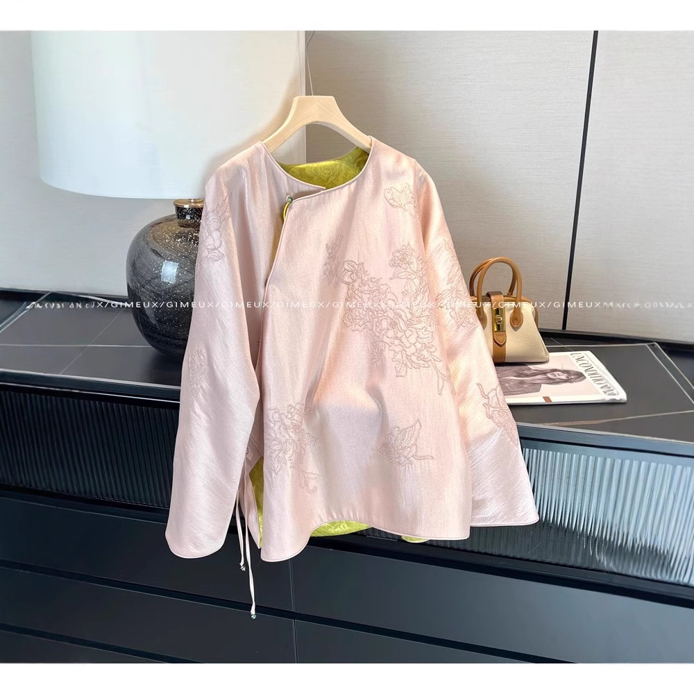 フランス式の灯籠の袖の刺繍のシャツの女性2025春秋の新型の中国風の高級感の気質は上着を打ちます。
