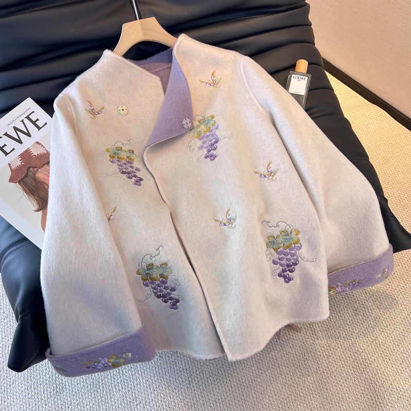 新中式紫葡萄重工刺绣羊毛大衣2025秋冬新款国风双面穿毛呢外套女
