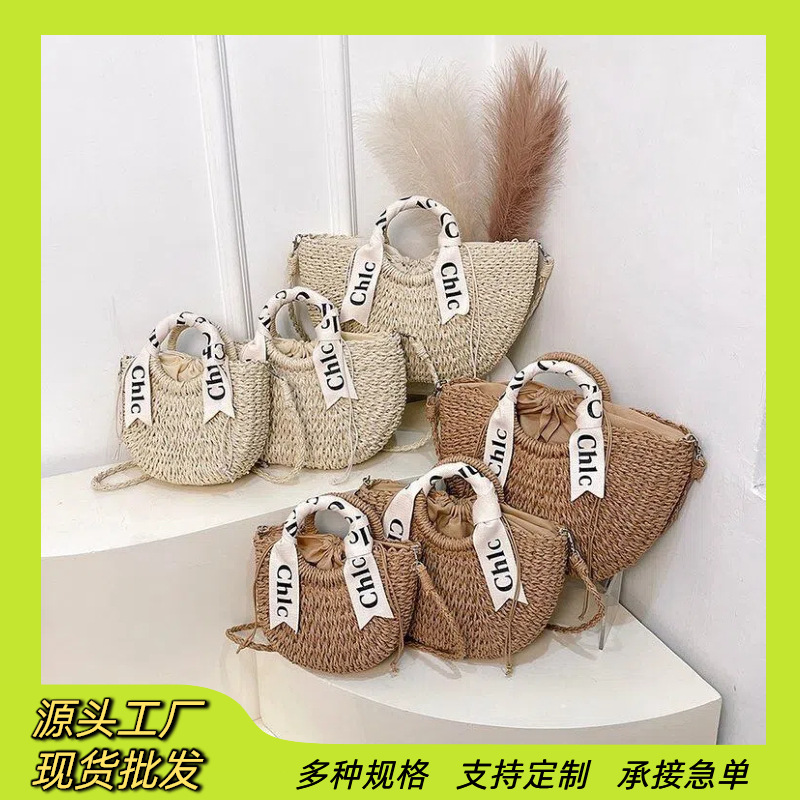 在庫あり卸売レターリボンハンドバッグ、半円形手織りバッグ、多用途ホリデーバッグ、ビーチストローバッグ、レディースバッグ