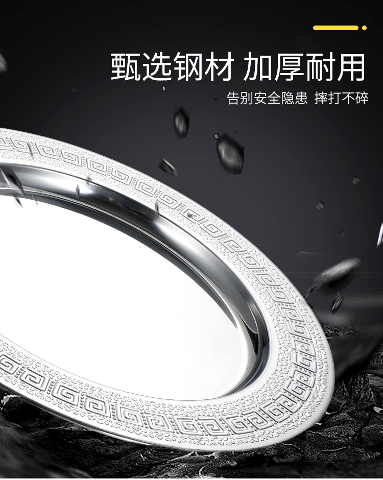 新登場のステンレス33丸皿、平皿、食器皿、ステーキ皿、ロゴ入り、輸出用、多サイズ、柱状皿、家庭用