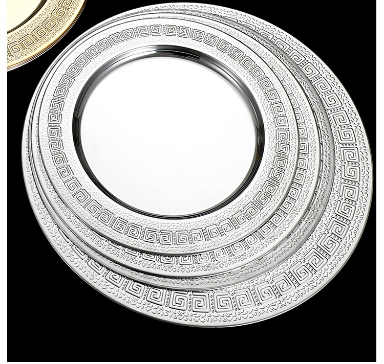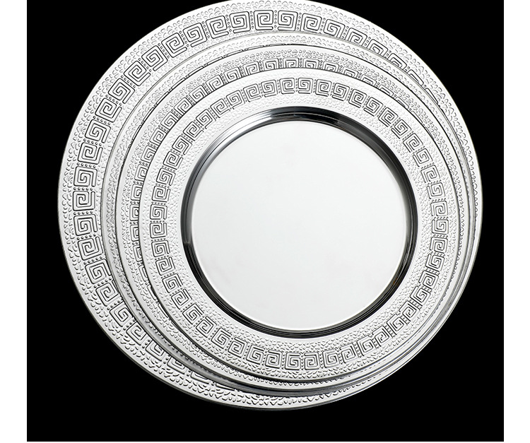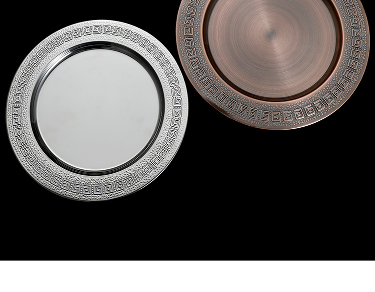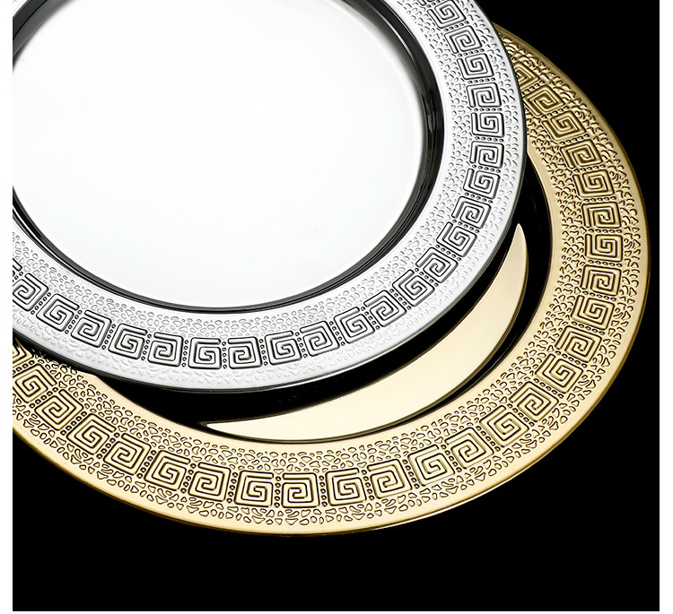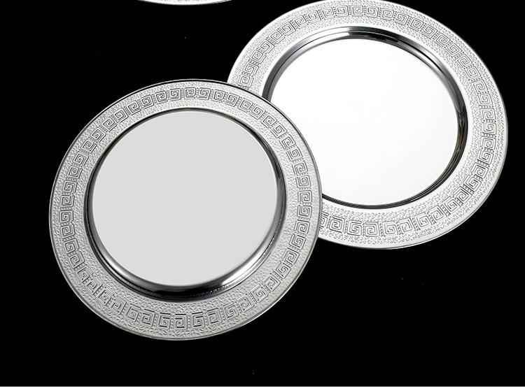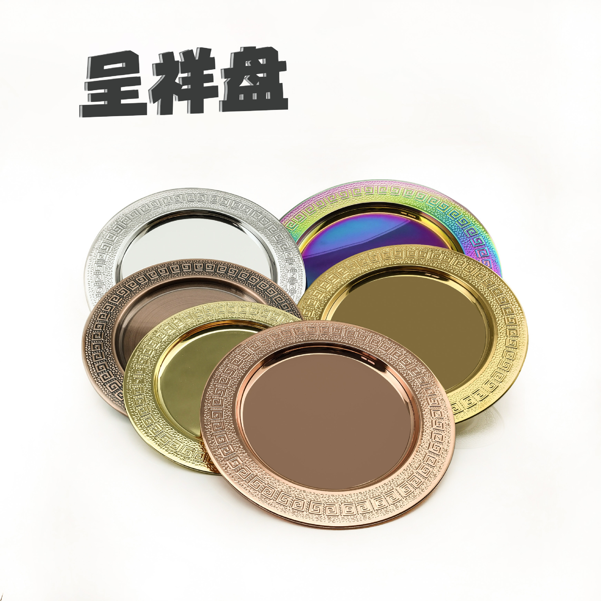 新跨境不锈钢圆盘镜面花纹33托盘摆盘工艺金垫盘俄罗斯西餐欧州