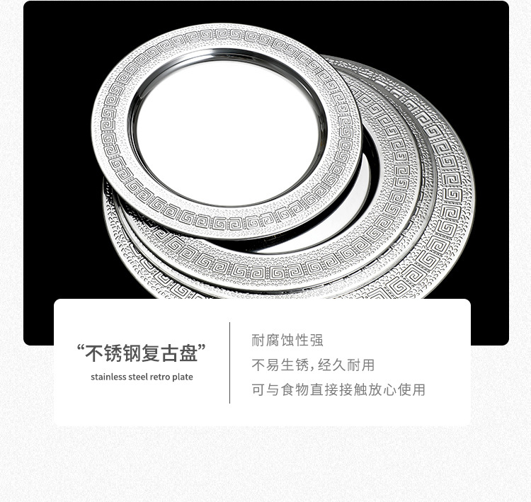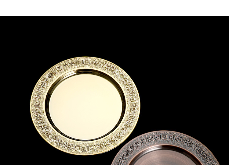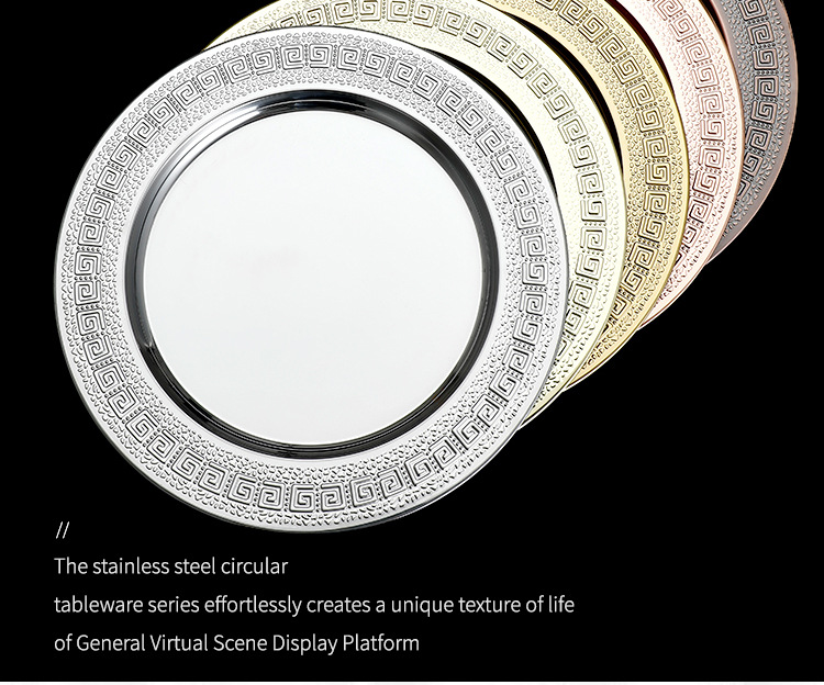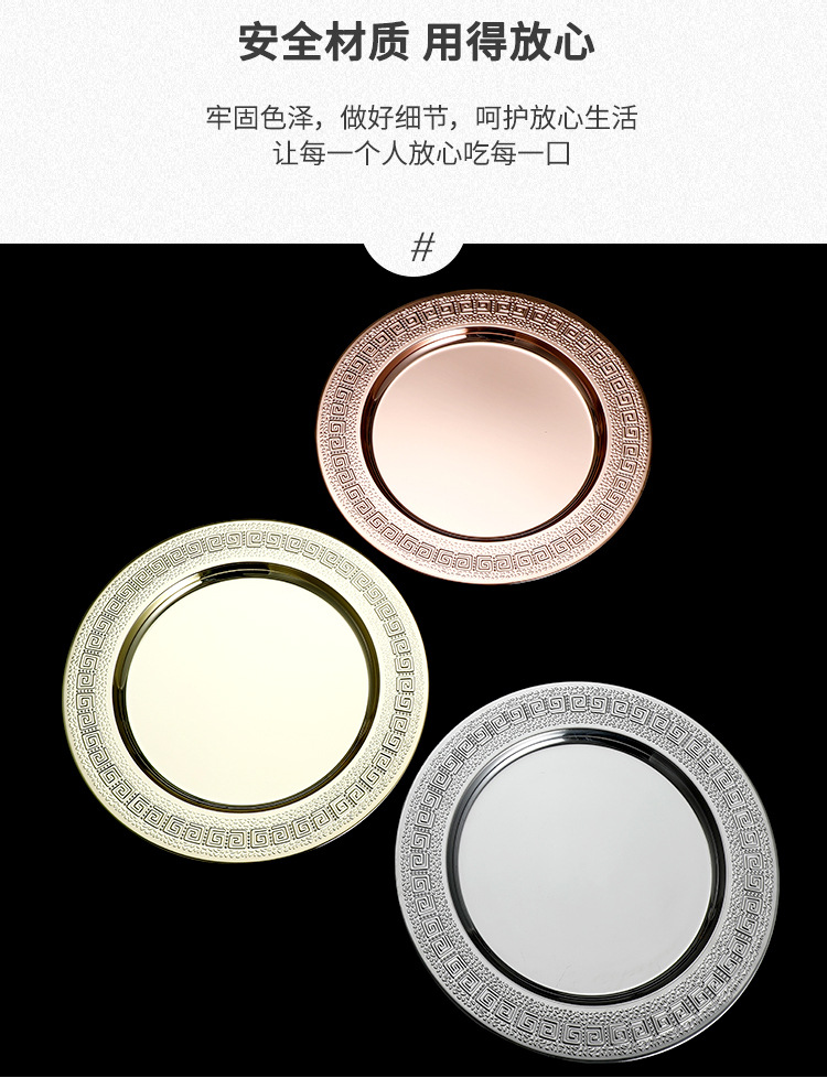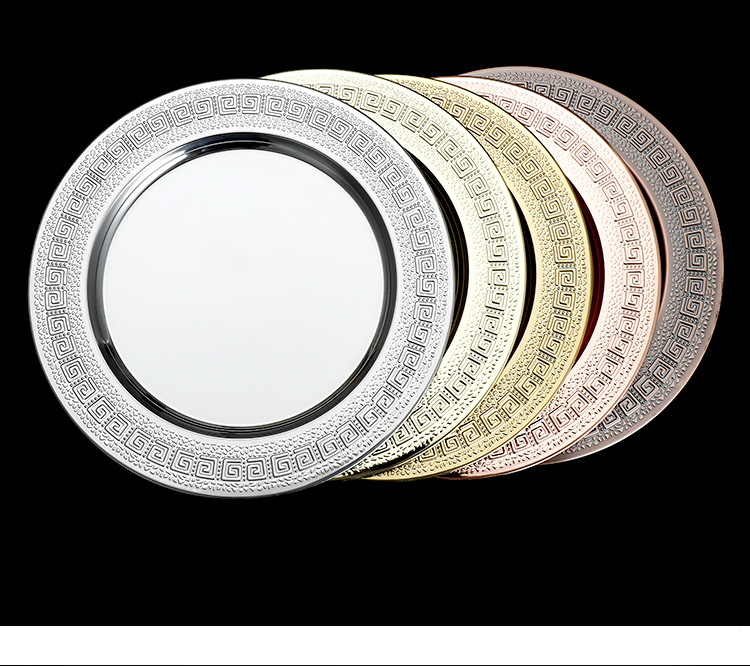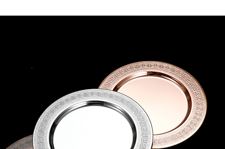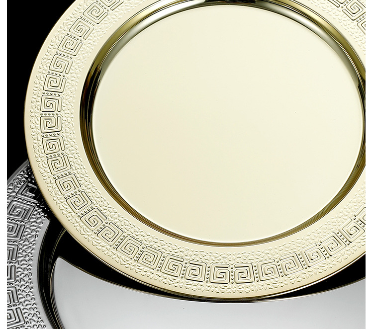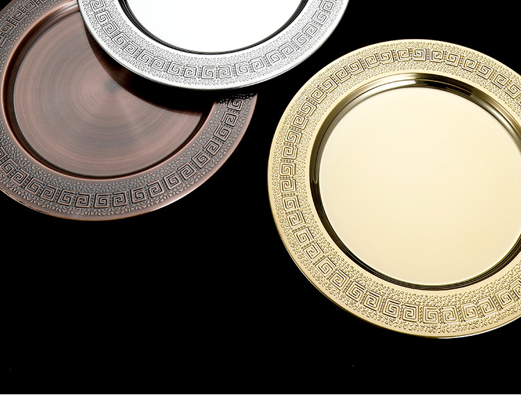 新跨境不锈钢圆盘镜面花纹33托盘摆盘工艺金垫盘俄罗斯西餐欧州