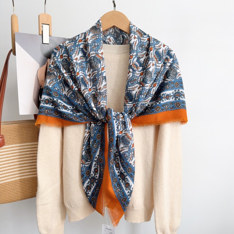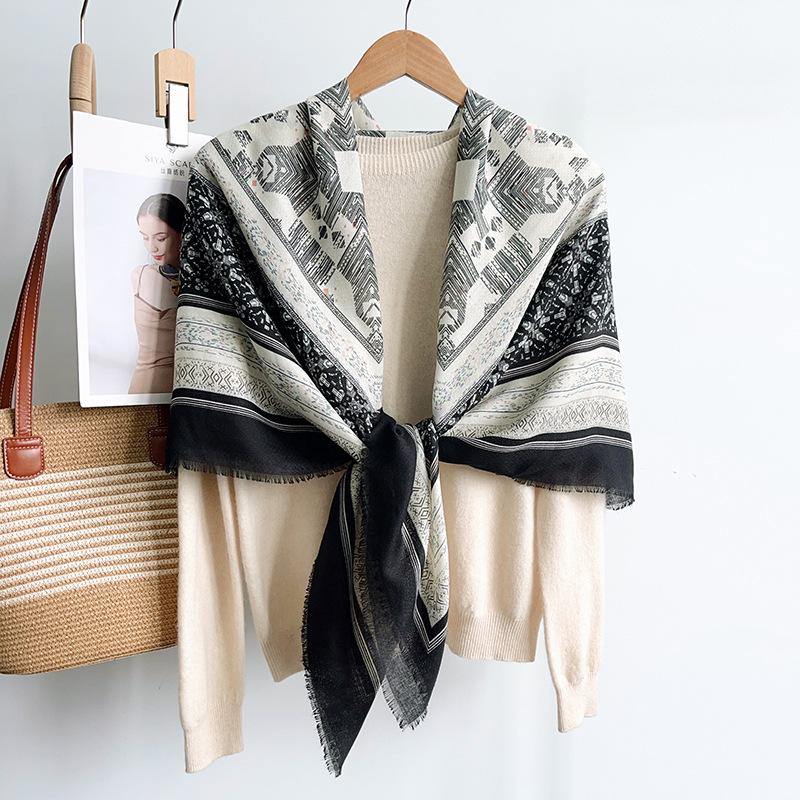 秋冬新款蓟花图案披肩老钱风保暖围巾女丝巾高级感系脖拆须大方巾