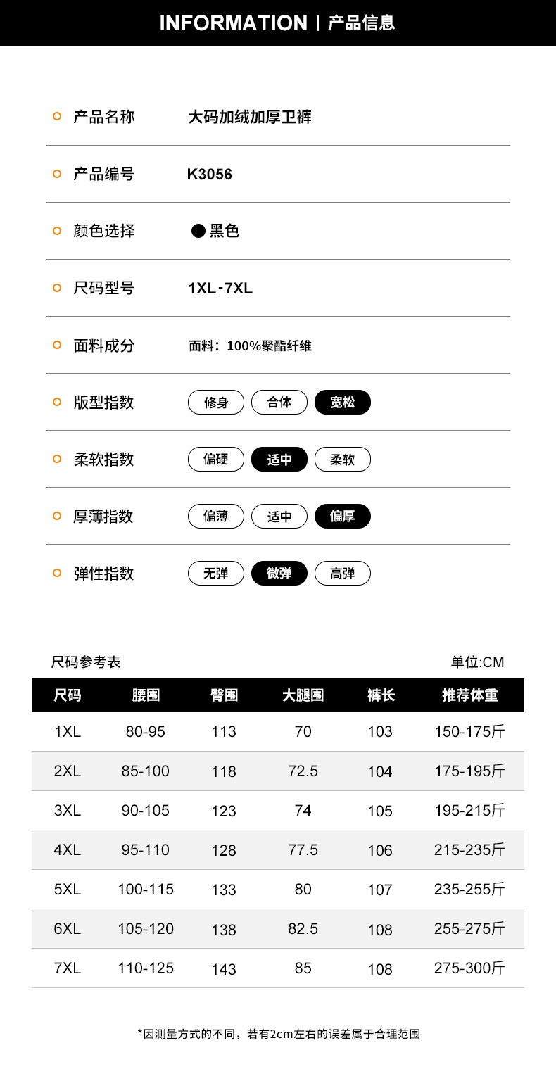 ズボンサイズ 1xl <175斤,2xl <195斤,3xl <215斤,4xl <235斤,5xl <255斤,6xl <275斤,7xl <300斤