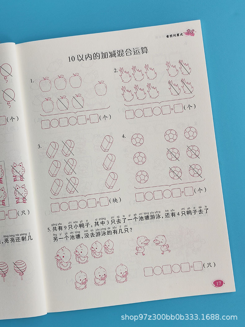 幼い子供が一日に言語ピンイン数学加減算練習帳を練習する前に加減算訓練を準備する