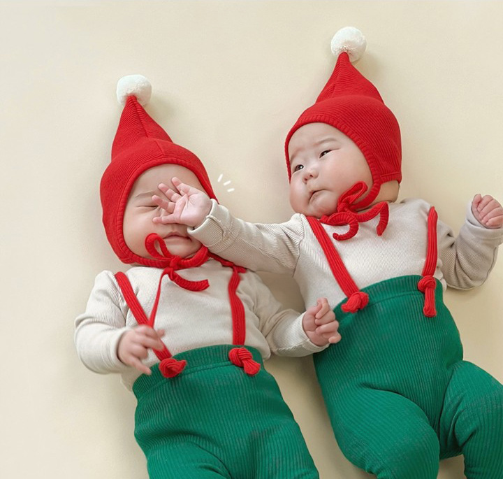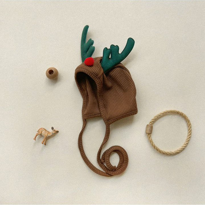 茶色の枝角の帽子,赤いボールの帽子,アントラー ブラウン オーバーオール,緑のオーバーオール