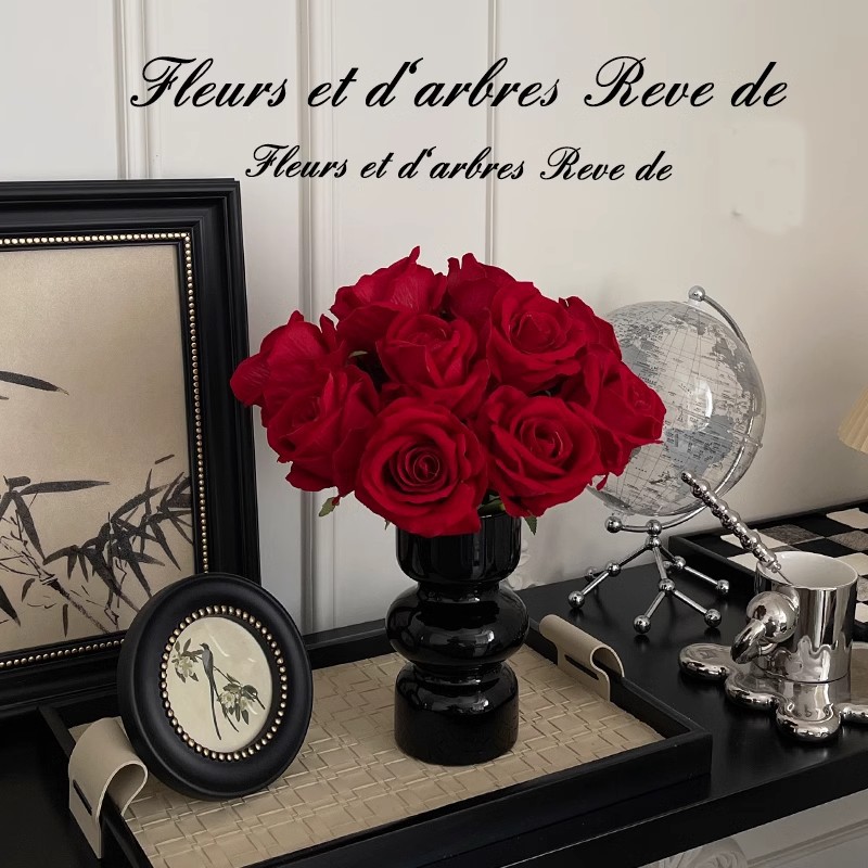高級な赤いベルベットのバラのシミュレーション花の造花の客間の食卓は玄関の花芸の中古の黒い花瓶の置物に入ります。