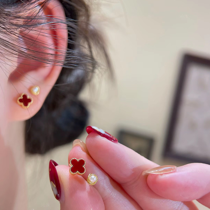 红色幸运草珠珠耳钉四件套耳环法式精致百搭轻奢气质S925银针耳饰