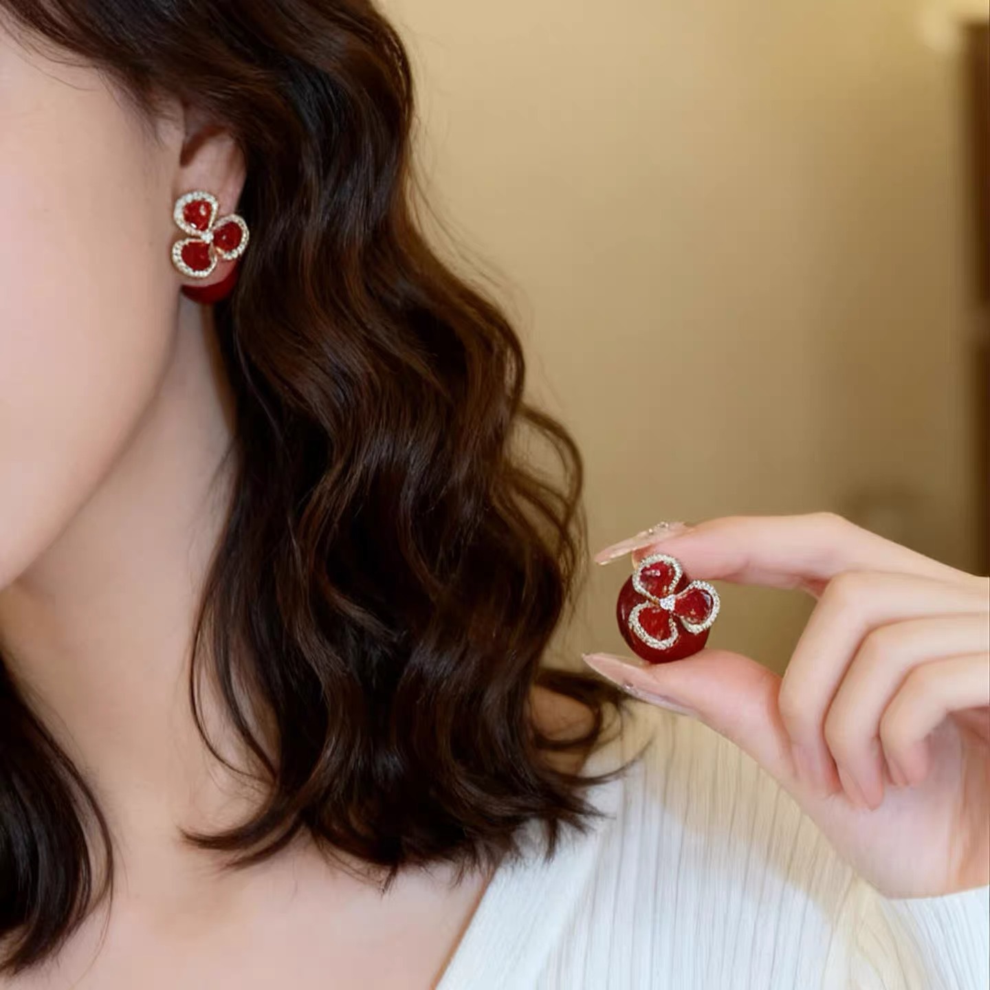 秋冬复古轻奢一款两戴红色花朵珍珠耳钉耳环时尚气质百搭耳饰女