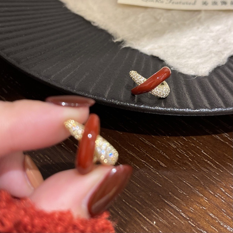 秋冬は赤い滴の油を交差して小さくジルコンのピアスを入れます。