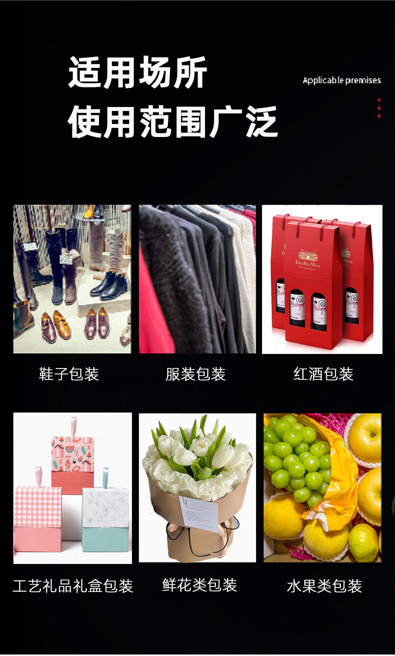 产品用途:适用于服装、红酒、工艺品、鞋子、皮具包包、鲜花、礼物礼品、水果包装等,提高品牌的知名度及产品的形象档次。