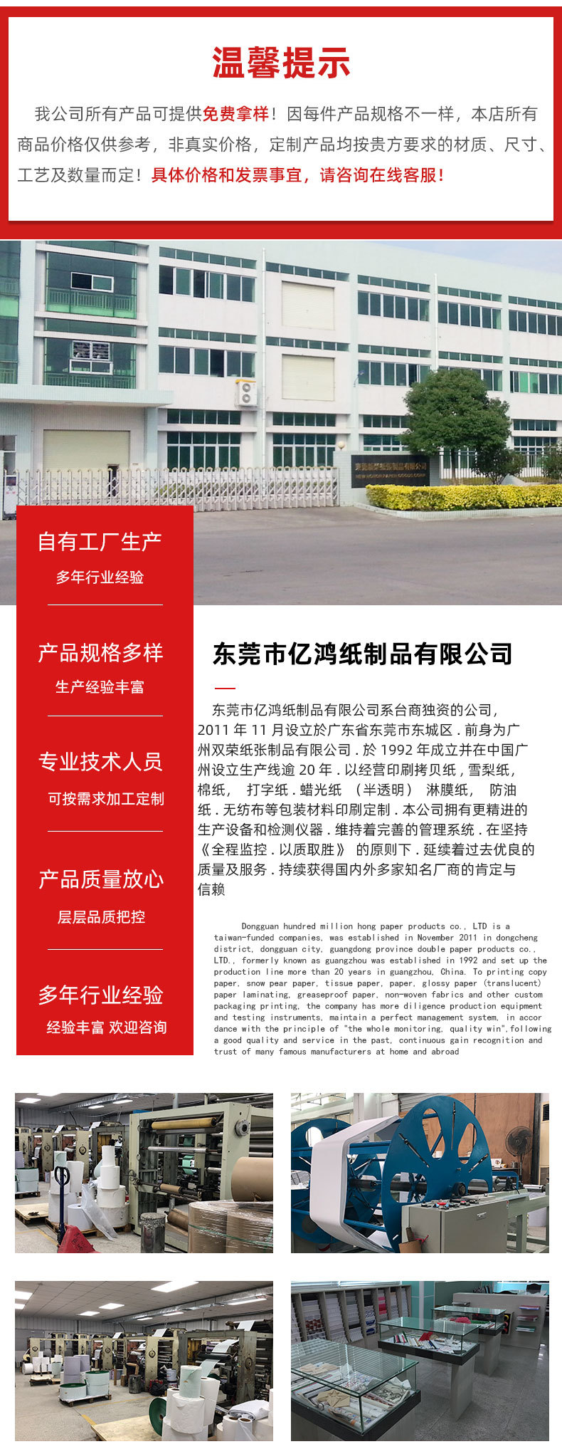 定制印刷logo:17克拷贝纸(雪梨纸)、30克哑面牛皮纸、31克蜡光纸、35-45-60-80克白牛皮纸、75-185克硫酸纸、80-120克双胶纸、105-157克双铜纸----等;