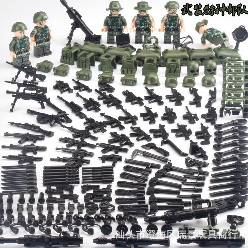 軍事人仔警察黒特警1620公仔は武器子供と一緒に積み木袋を入れて国境を越えた対外貿易をしている
