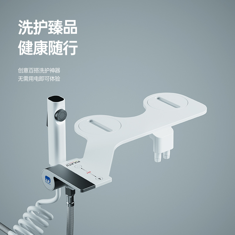 1:单旋钮流量调节 2:双孔喷嘴冲洗 3:臀洗妇洗双喷嘴带自洁 4:带置物架挂钩 5:主体可折叠可拆卸 6:主体超薄7MM