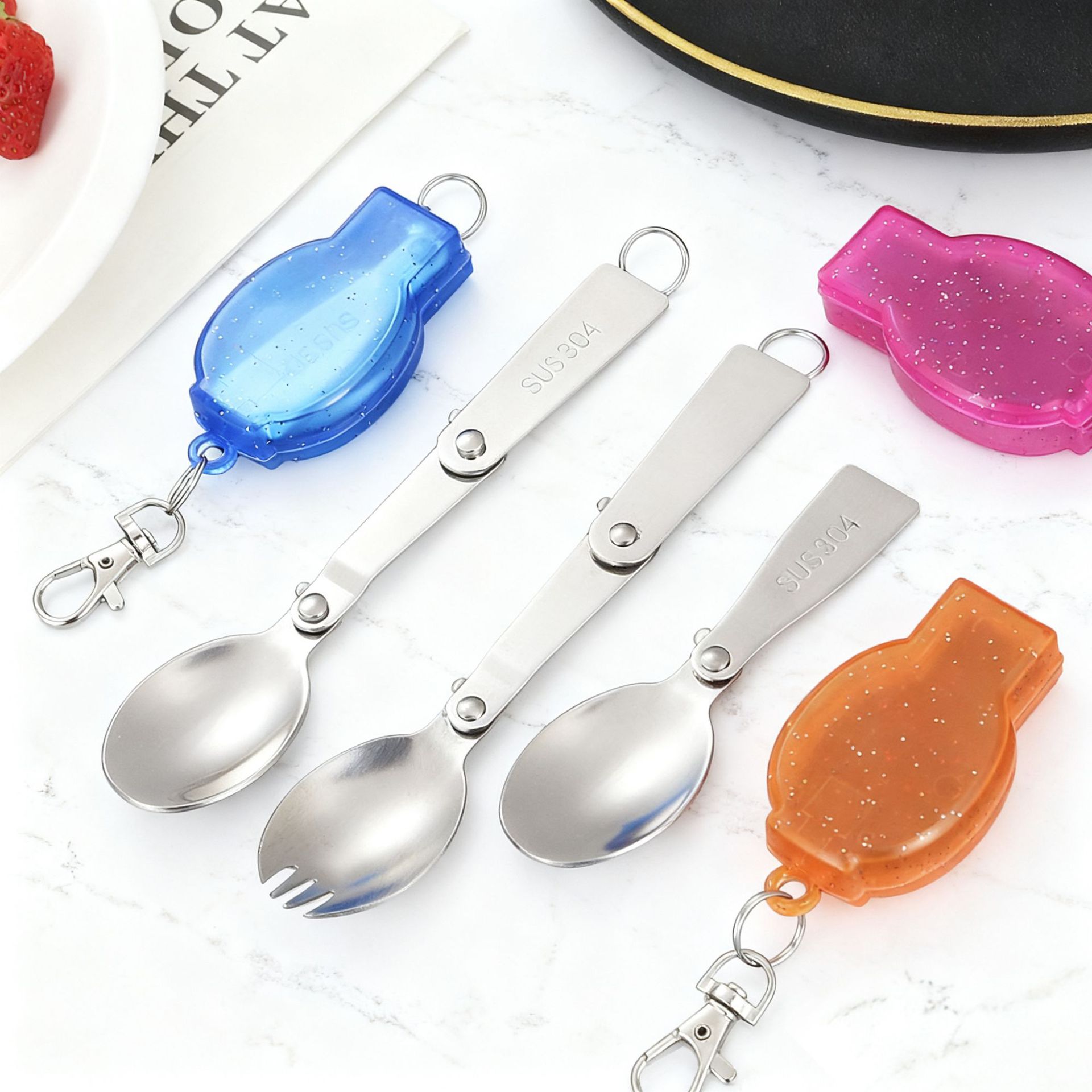 304ステンレス折りたたみポータブル食器屋外ピクニックキャンプ旅行ポータブル回転二つ折りスプーンミニスプーンフォーク