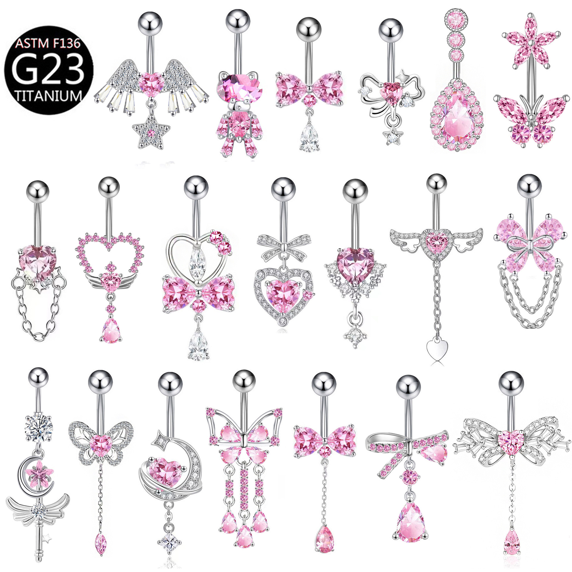 ヨーロッパとアメリカの新しい G23 チタンピンクリボンへそネイルラブバタフライウォータードロップペンダント F136 チタン合金へそリング