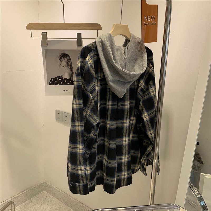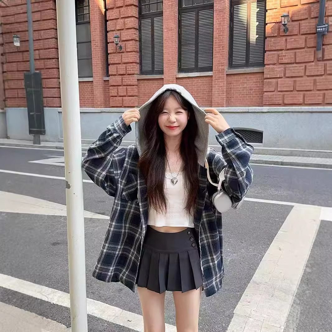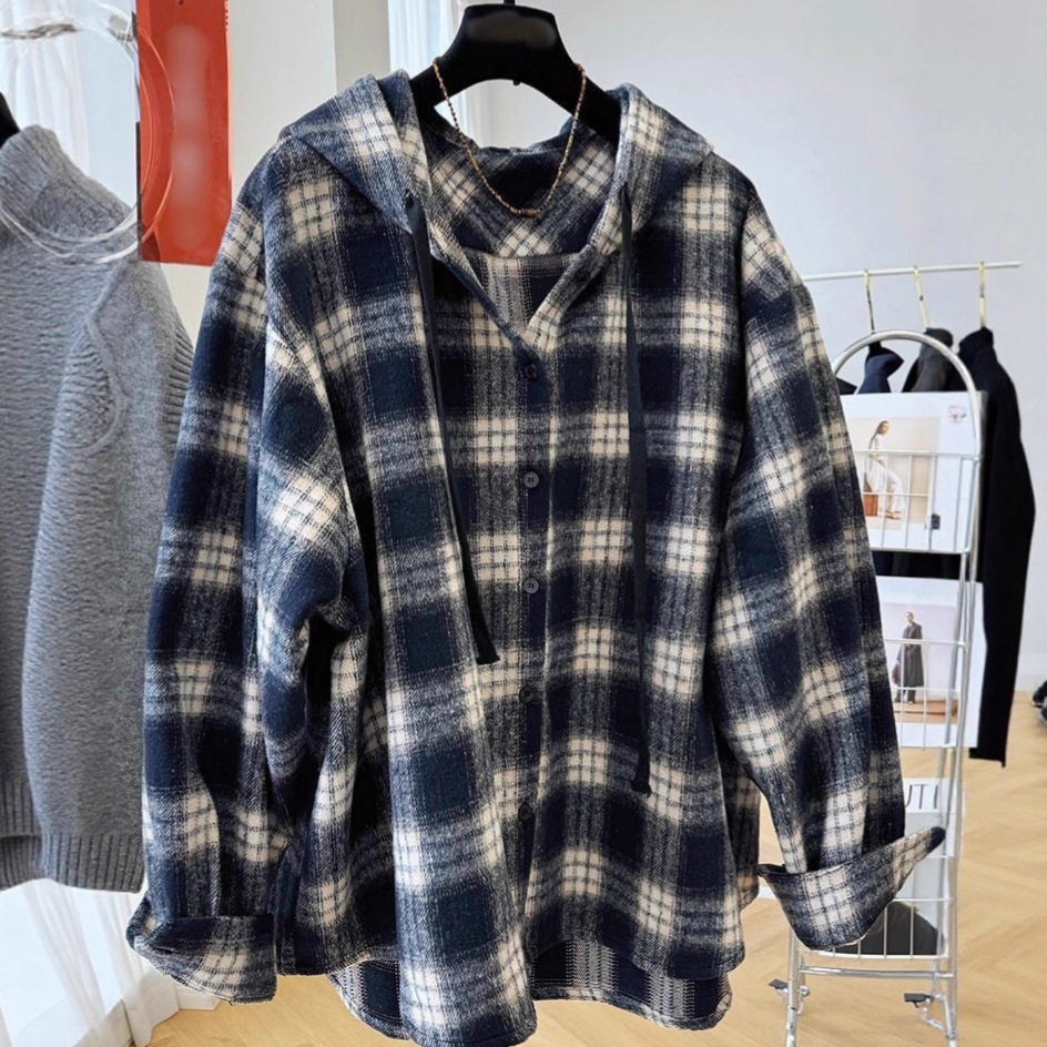 春、夏、秋のチェック柄シャツレディースレトロ香港スタイルインルーズフード付きカーディガンジャケットシャツ