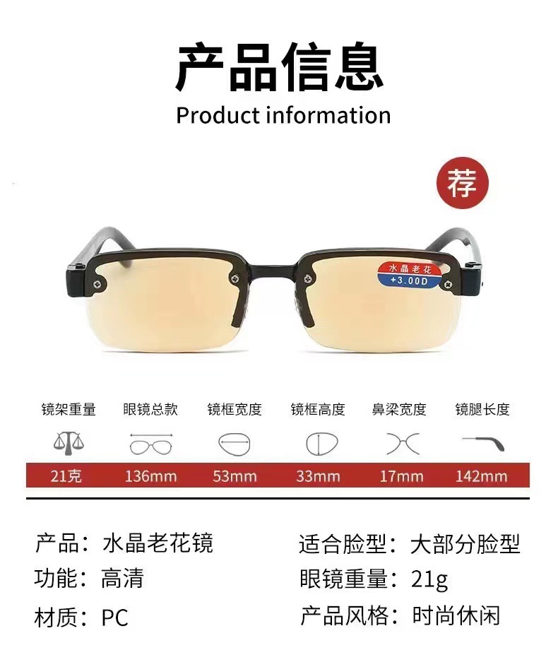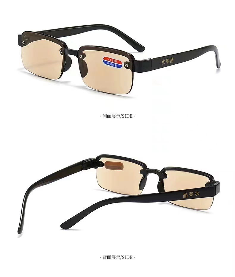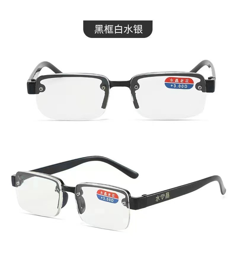 スマートズームクリスタル老眼鏡、高精細、ブルーライトカット、高齢者向けメガネ、高級感、プレーンハーフフレーム、平面レンズ