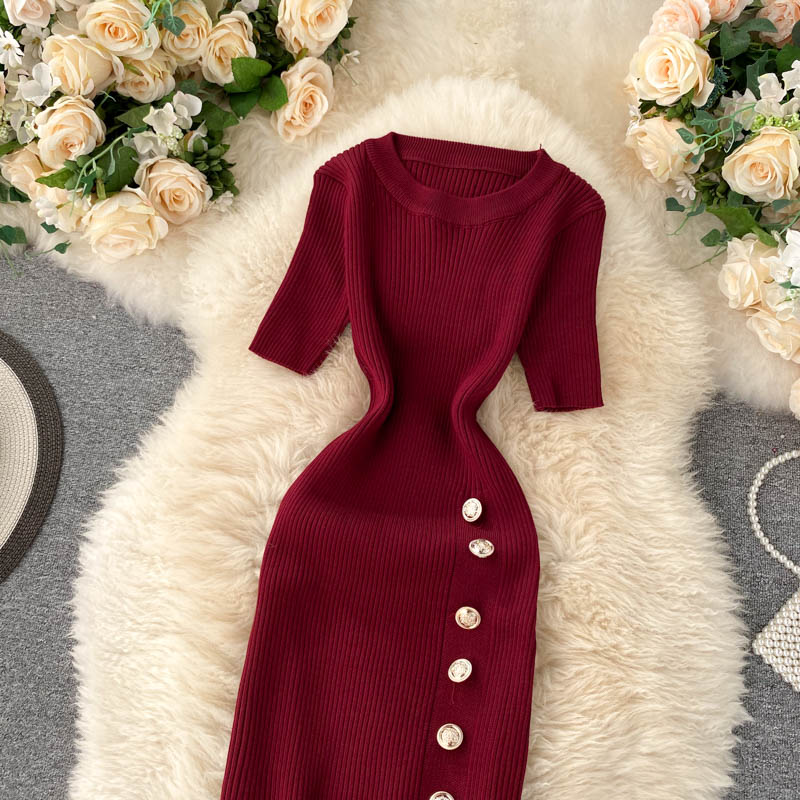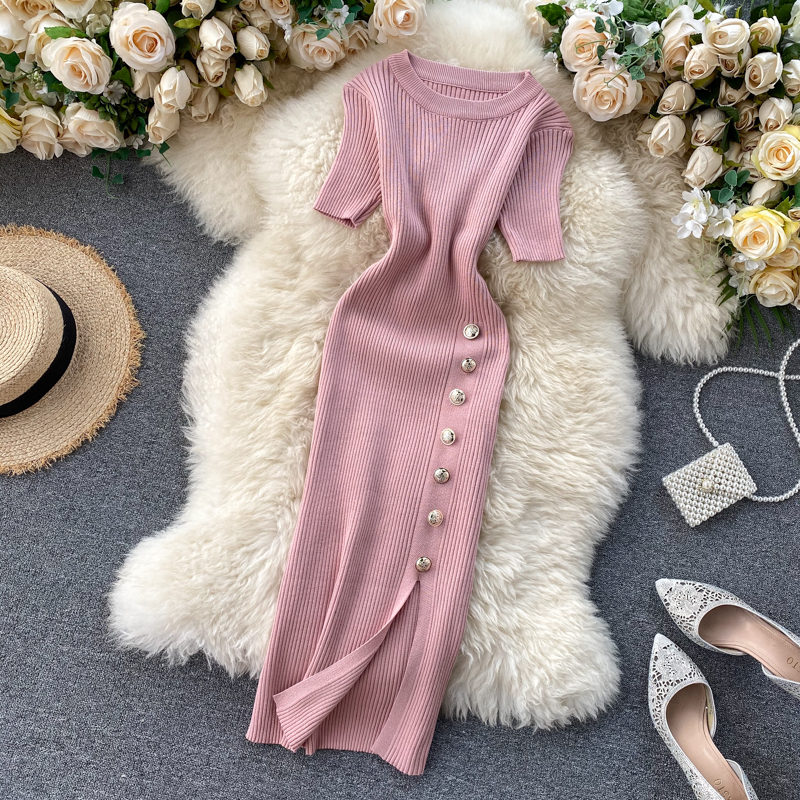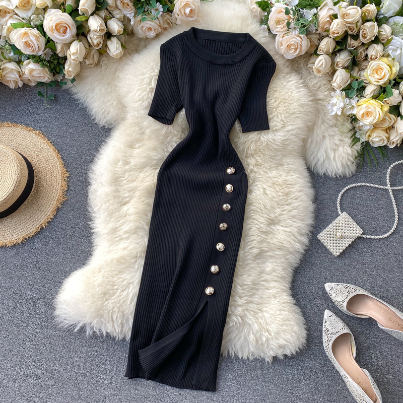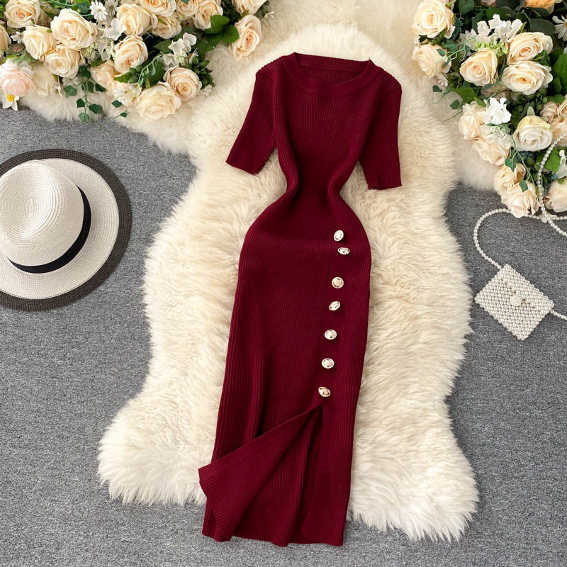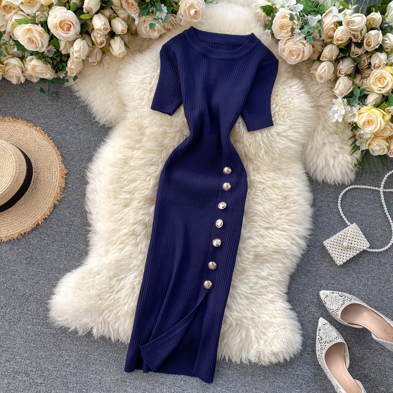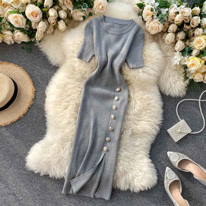 ヨーロッパとアメリカのクロスボーダー春夏ニットドレス女性のミドル丈ウエストスリットセータードレス