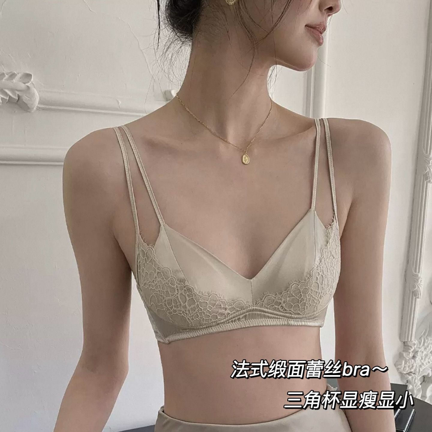 “月光情书”法式三角杯缎面拼蕾丝聚内衣女大胸显小胸双肩带文胸