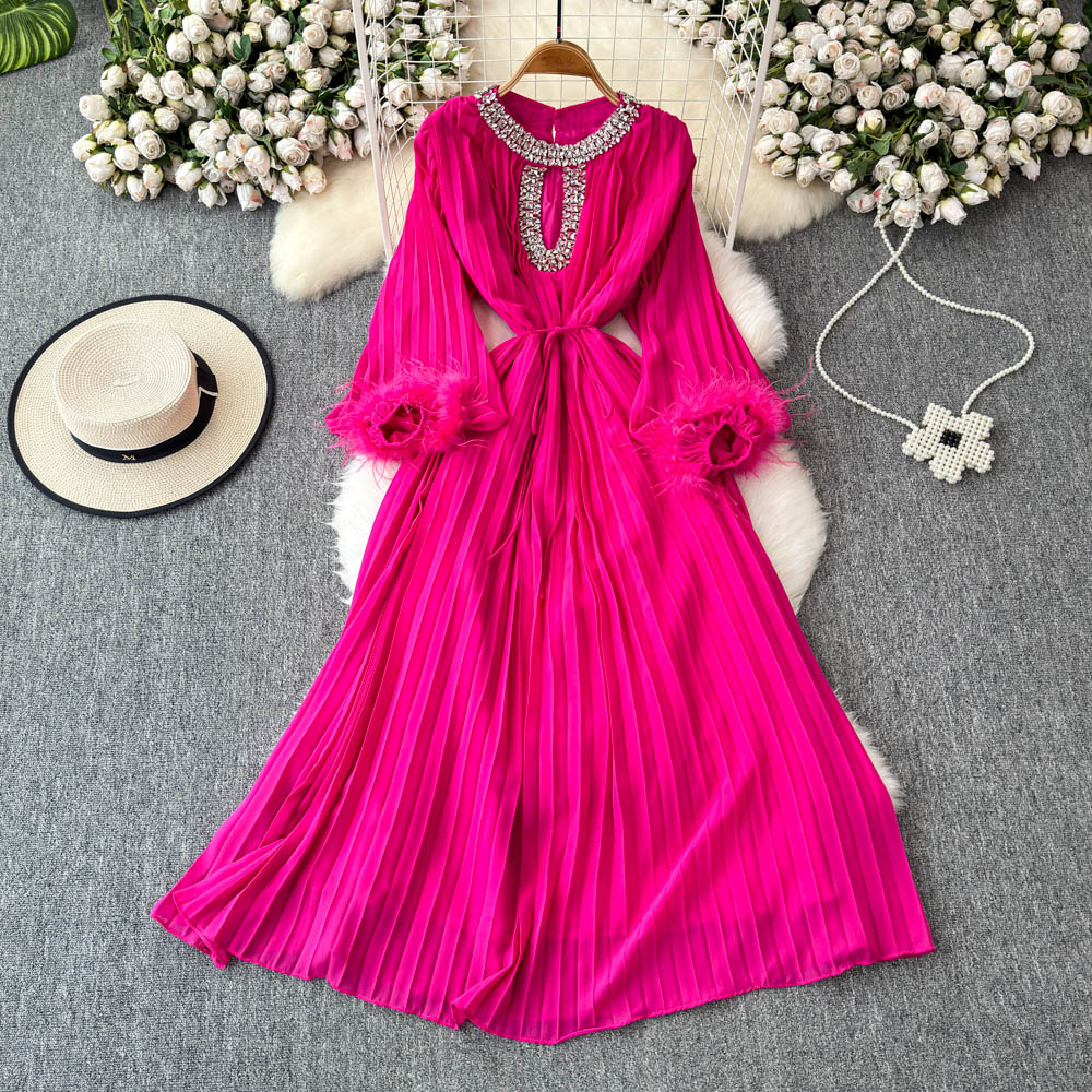欧米風ファッション気質名媛風袖口ダチョウ毛装飾ワンピース