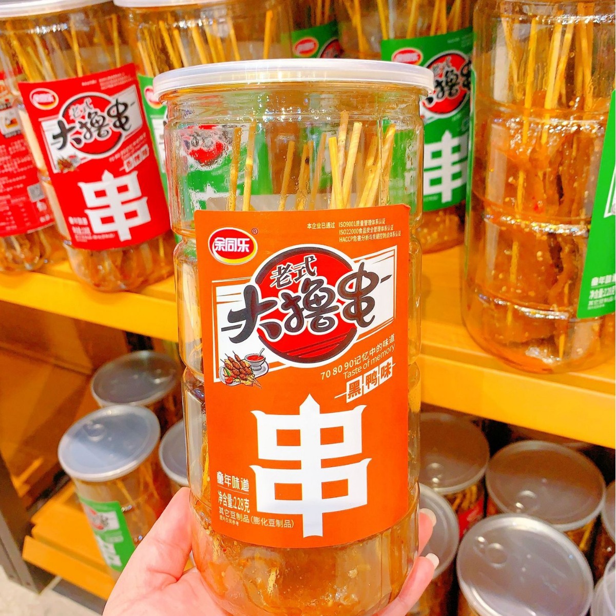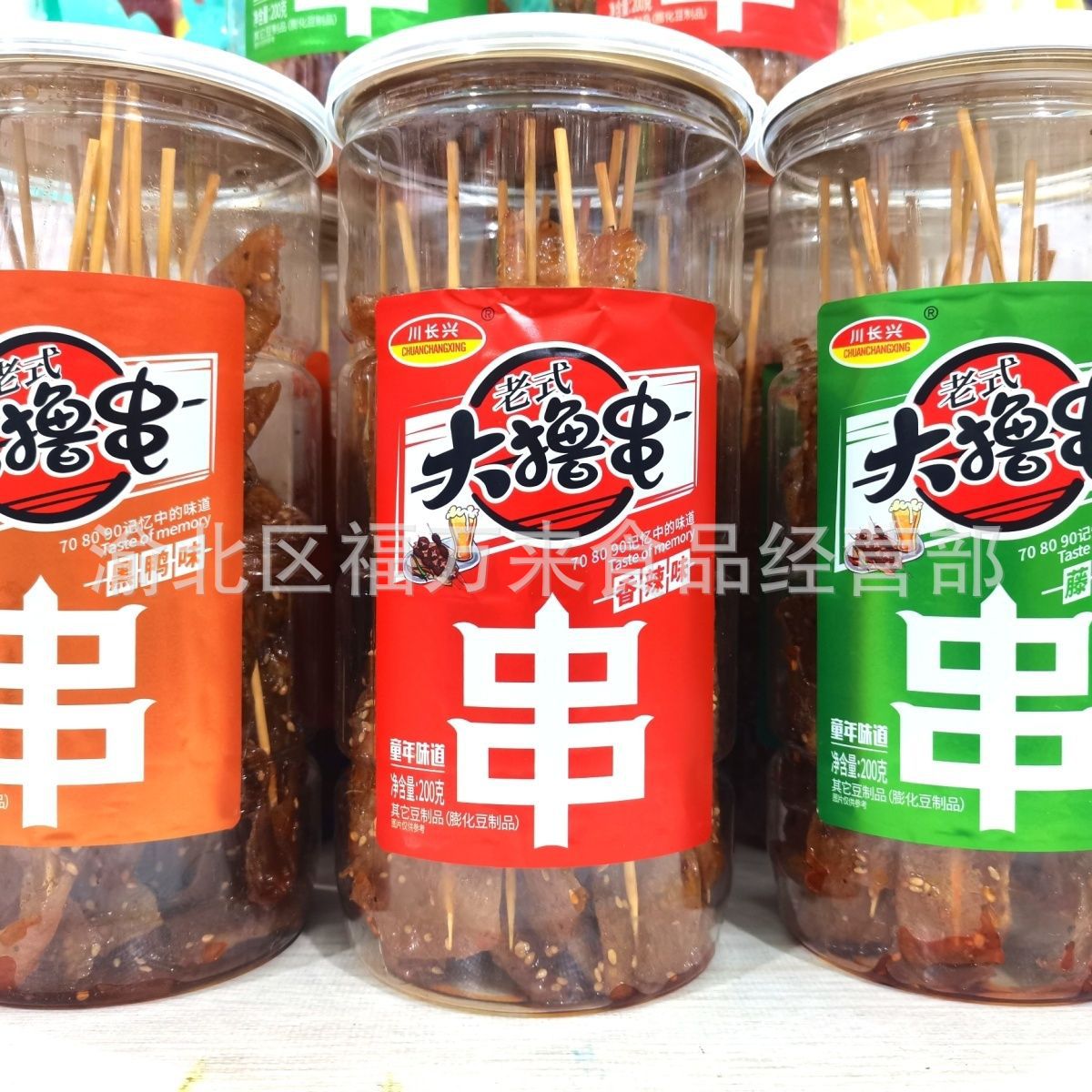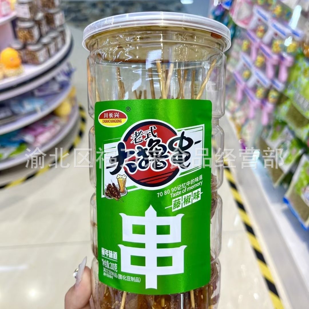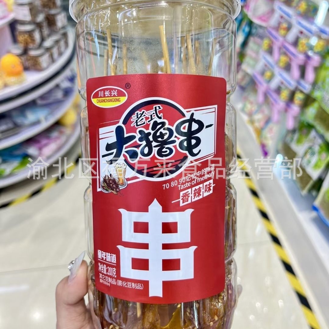 川長興大は辛辣な条を刺して子供の時に経典の豆の乾燥している製品の辛辣な皮のネットのネットの赤いレジャーの90後で昔を懐かしんでいる間食の桶に詰めます。