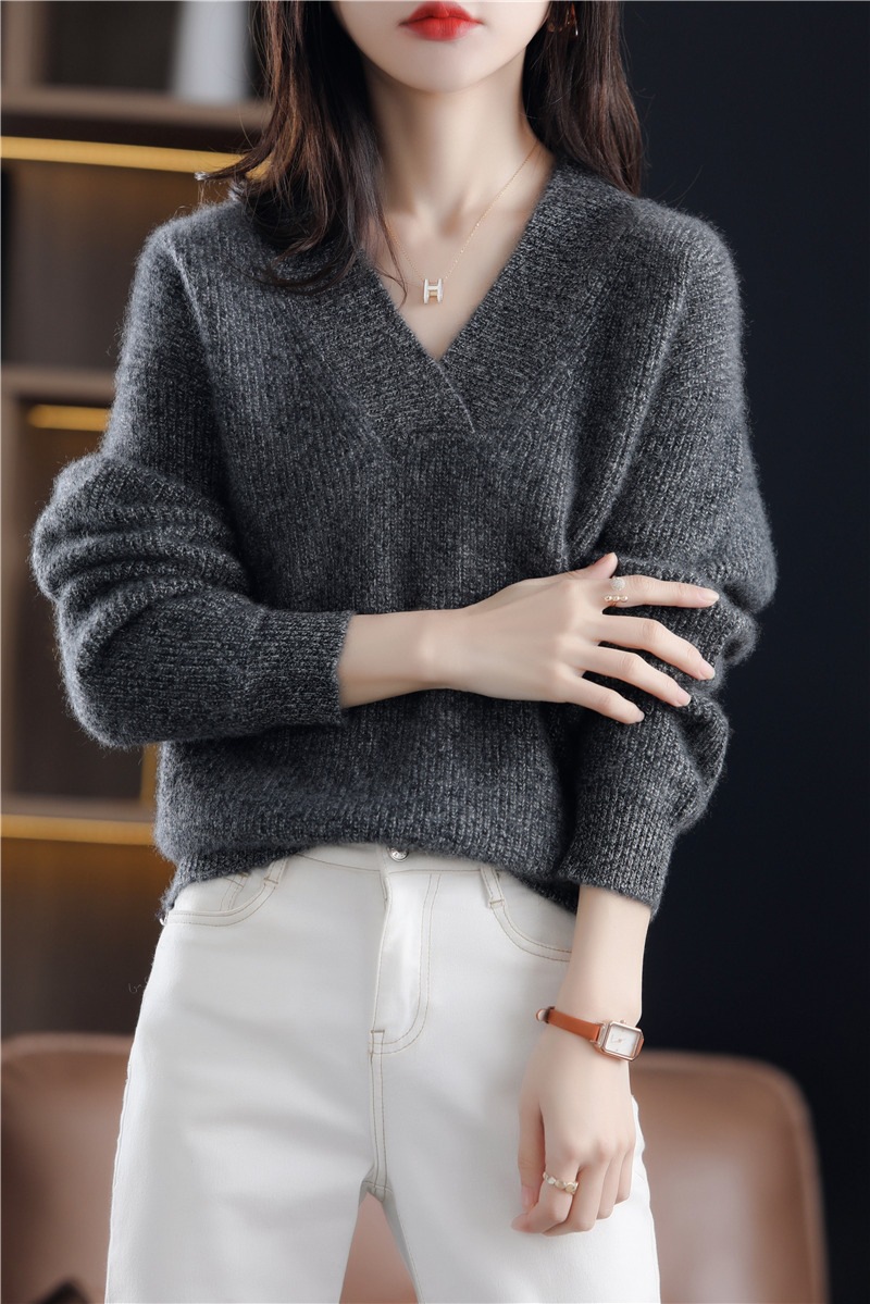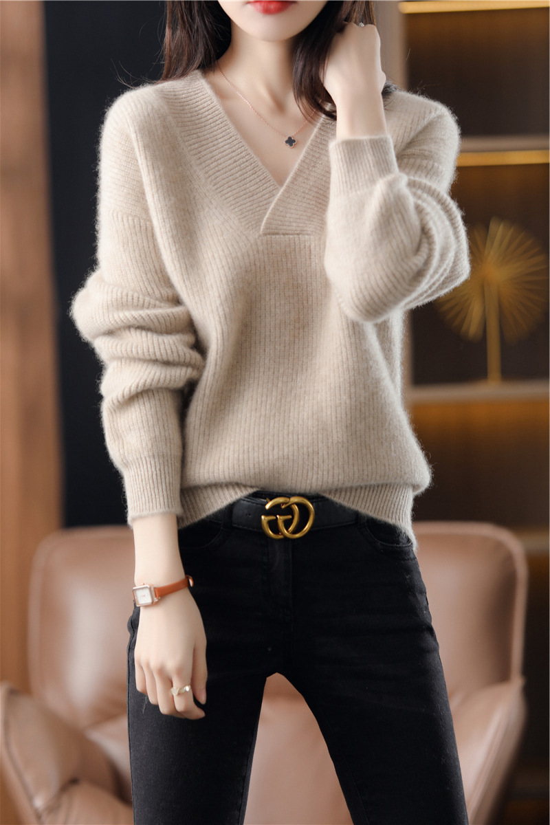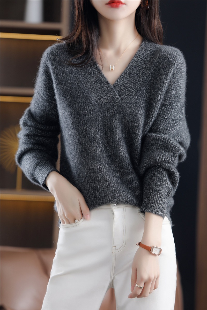 風の純色のvネックの頭はゆったりしていて、やせているニットの秋冬の新型の気質のカジュアルな組み合わせの底のシャツの女性を現します。