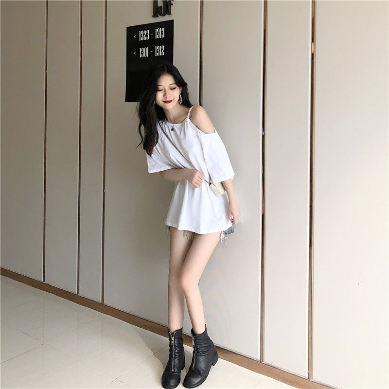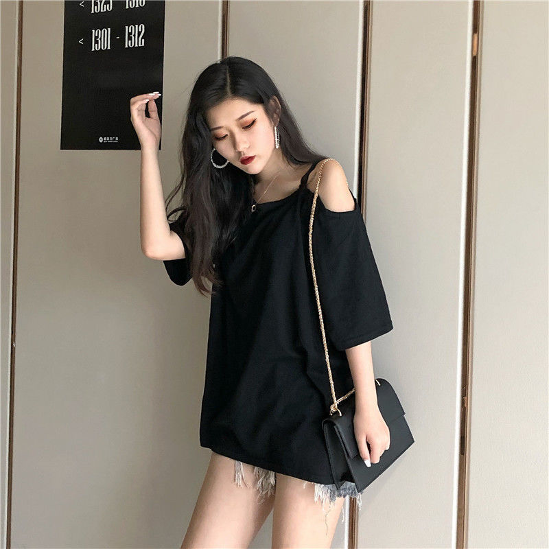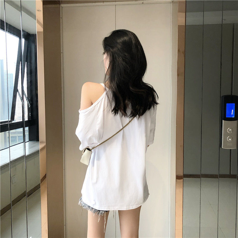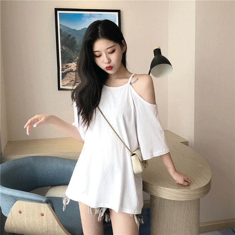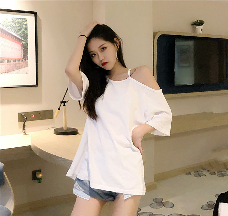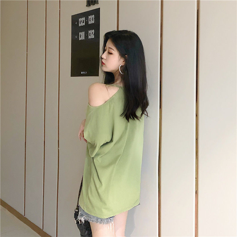 MR 【40番手レーヨン】韓国風夏斜め襟オフショルダーレース裾半袖Tシャツレディーススリムトップス