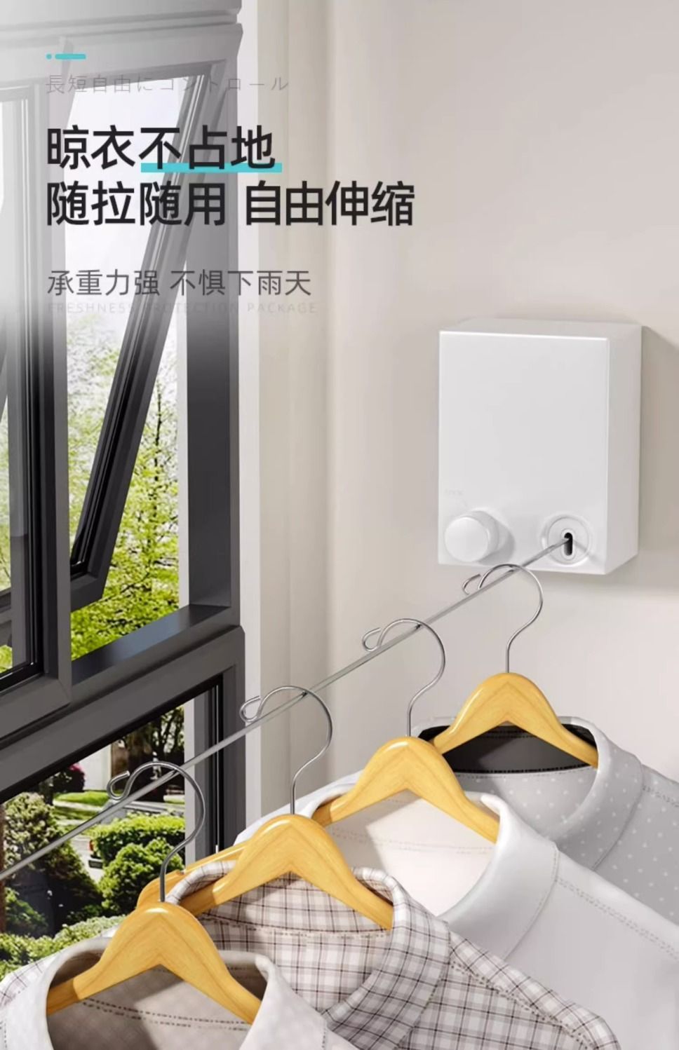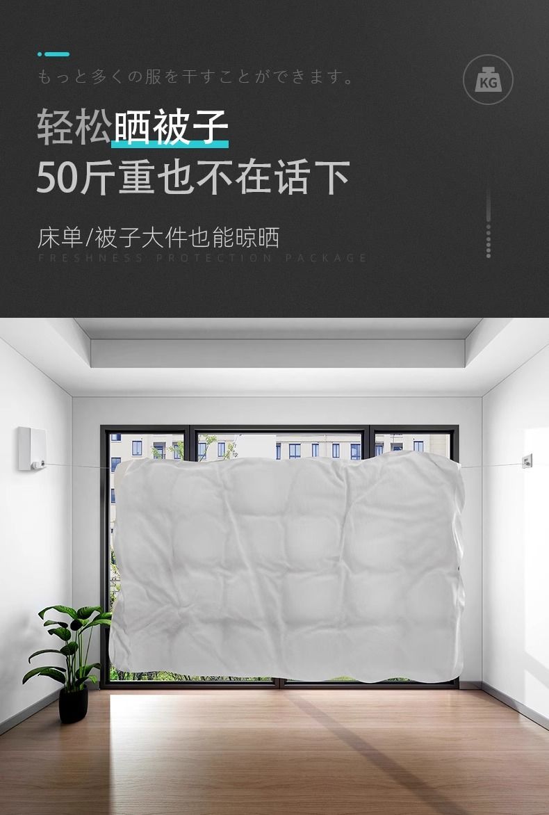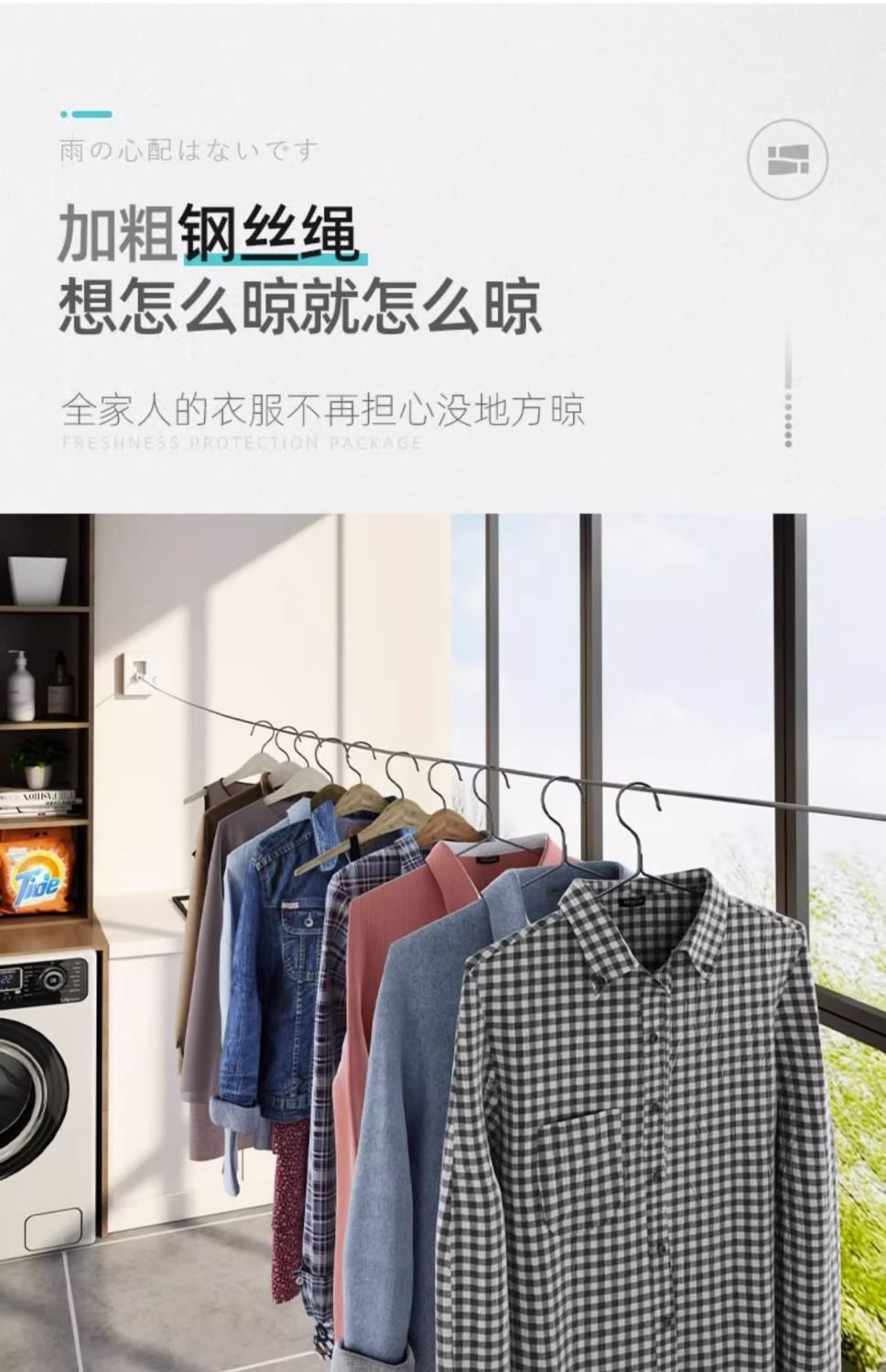 目に見えない物干し紐が収縮して洗濯物を干します。