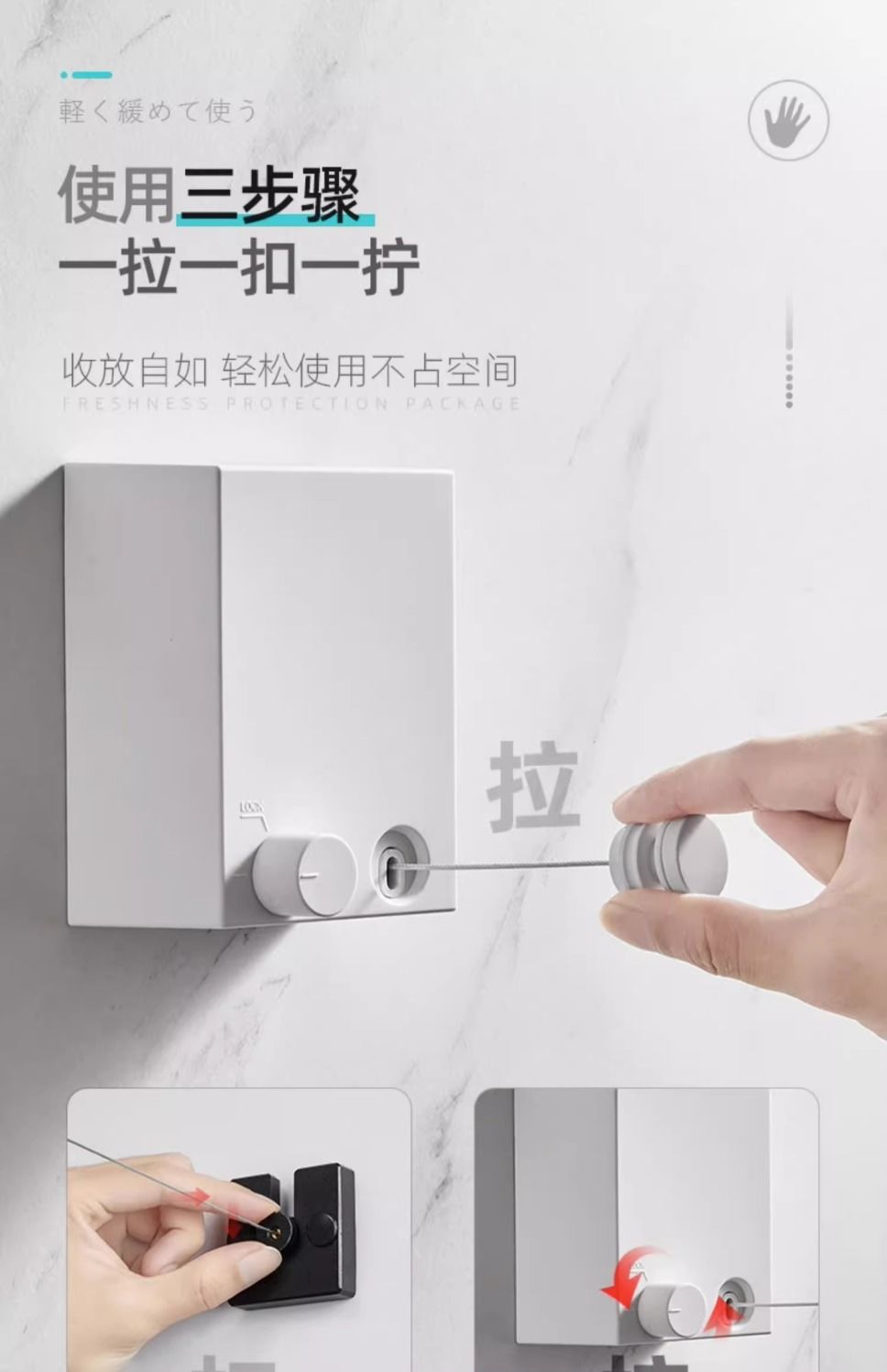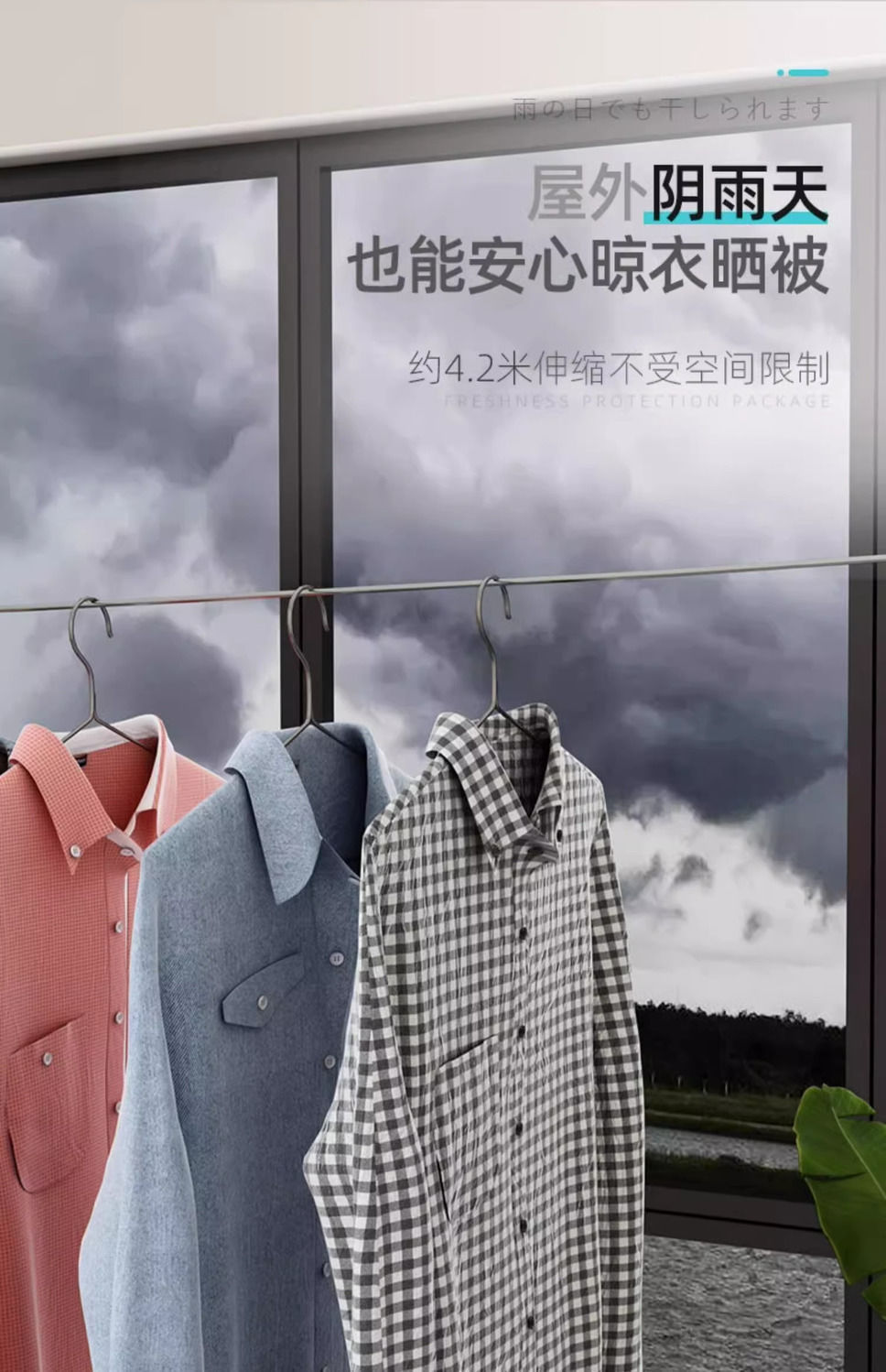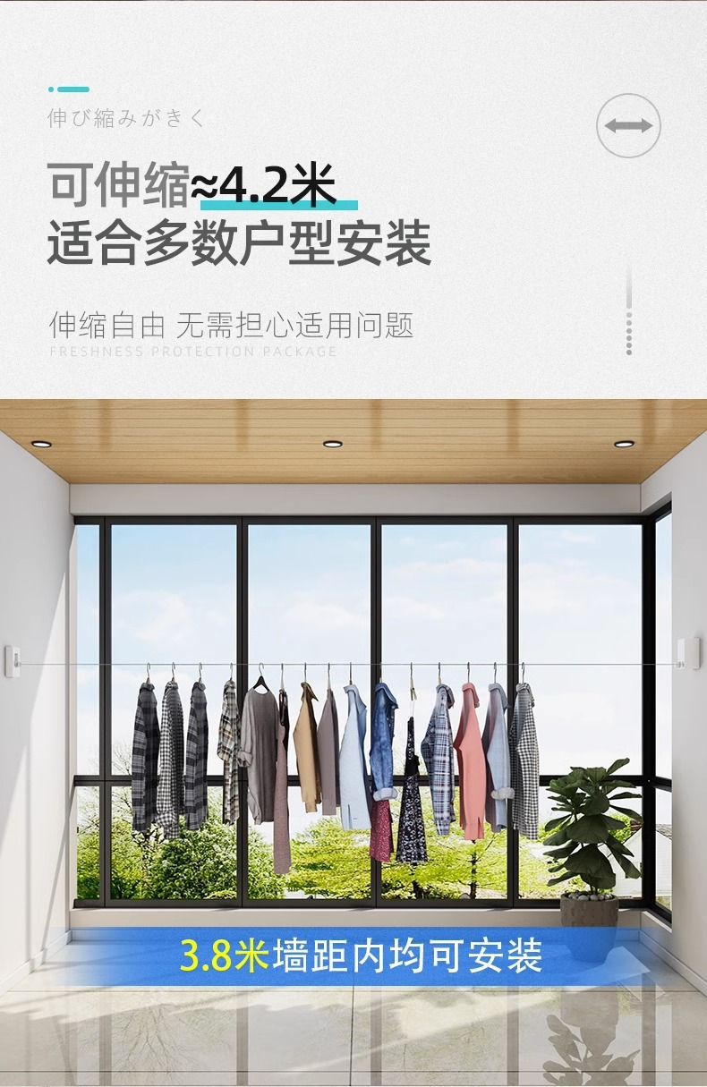 目に見えない物干し紐が収縮して洗濯物を干します。