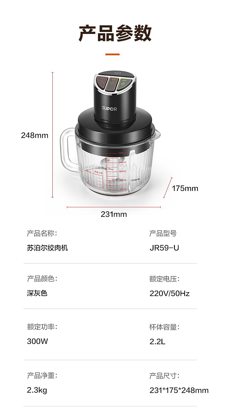 Supor 肉グラインダー 2.2L ステンレス鋼家庭用多機能肉グラインダーミキサー JR56-U