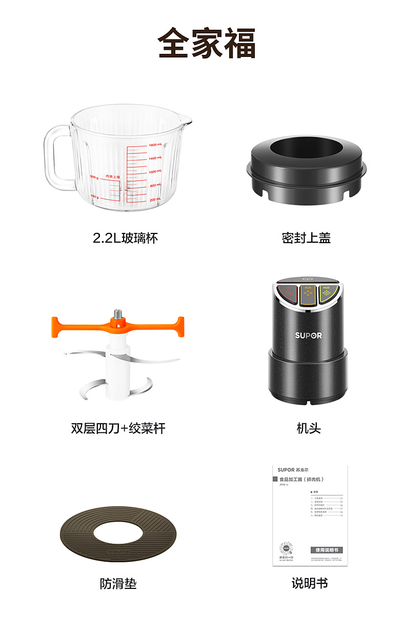 苏泊尔绞肉机悬浮刀家用自动多功能2L小型电动料理机JR66-B200