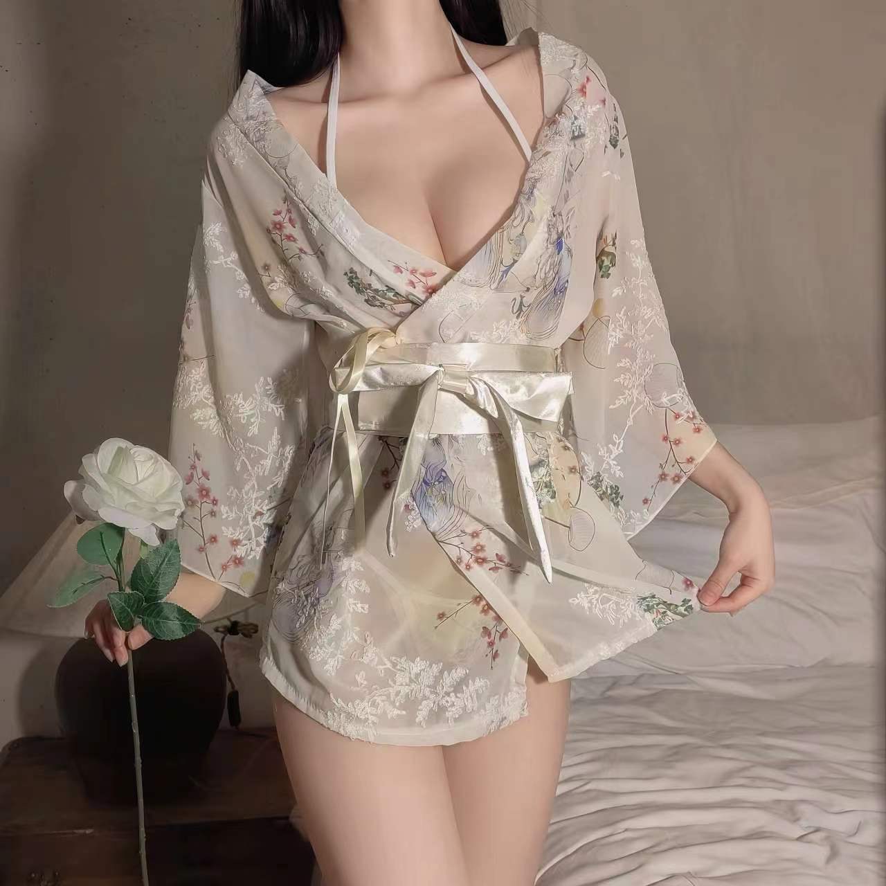 セクシーランジェリー 日本風セクシーカーディガン 三点式シフォンプリント着物風ホットユニフォーム 女性用セット 外出着としても着用可能