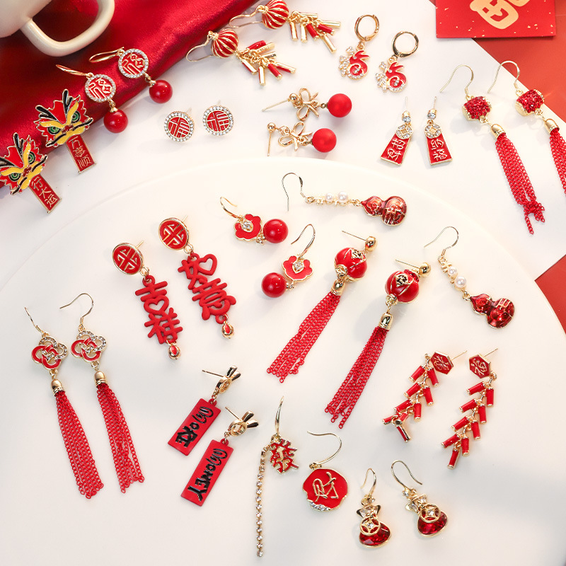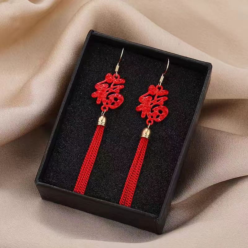 中国風の新年の赤い中国の結び目のフリンジイヤリングの女性の復古の長い金型の新年のピアスinsネットの赤いイヤリング