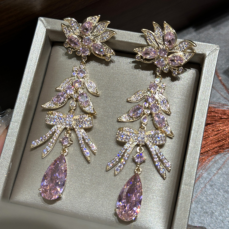 ハイエンドの金色のピンクのダイヤモンドの抽象的な花の蕊の蝶結びのピンクの水滴のイヤリングの独特な贅沢な水晶の宝石