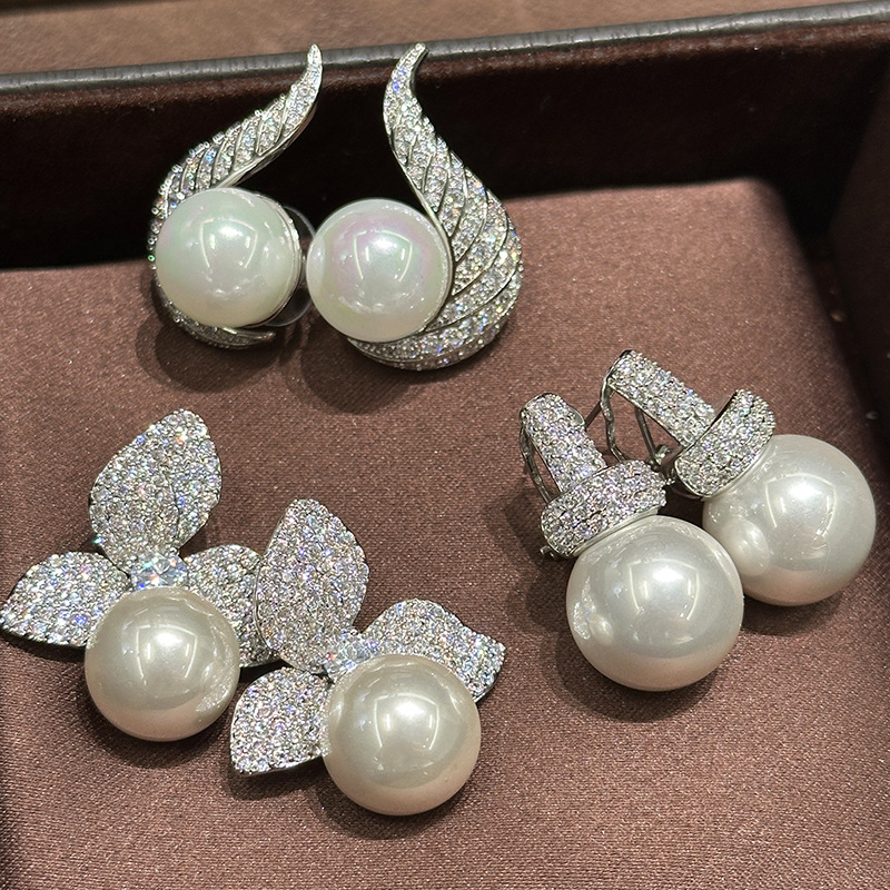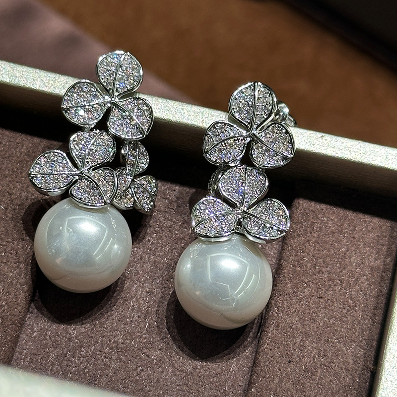 满钻叶子曲线珍珠耳环925纯银针设计感个性独特耳饰高级感树叶