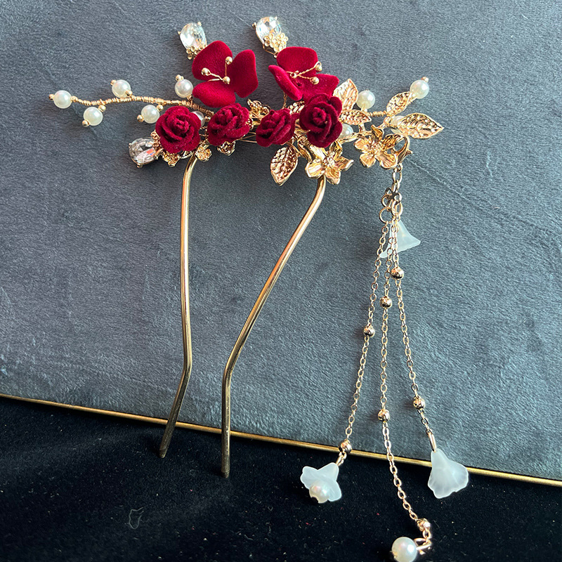 バラの髪は赤いu型のかんざしを挟んで結婚します。