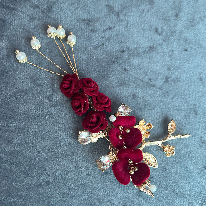 婚約新中国風ベルベットの赤いツバキのヘアピンの女性の後頭部花嫁敬酒服のサイドクリップの髪飾り