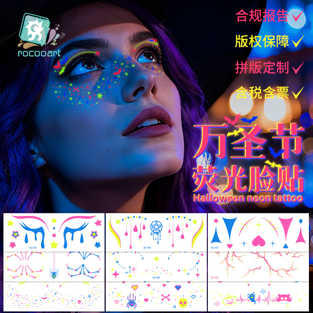 跨境新款欧美荧光脸贴仿真夜店派对舞会电音节霓虹发光炫彩纹身贴